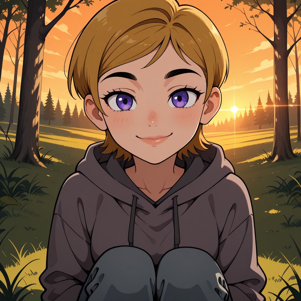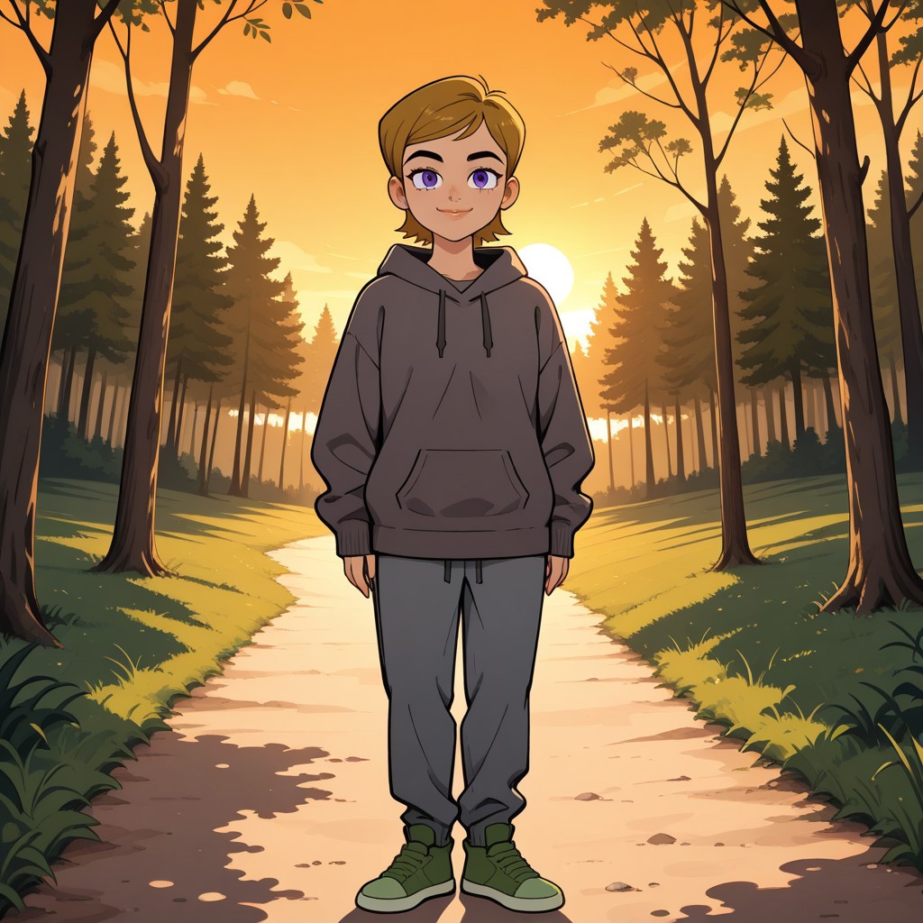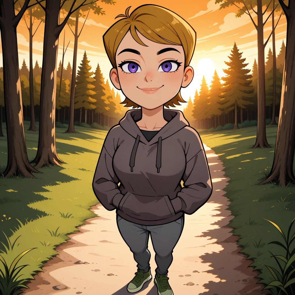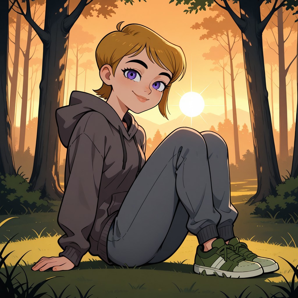 JoTDI, 1girl, dark blonde hair, short hair, indigo eyes, black eyebrows, lips, dark gray hoodie, dark gray pants, green sneakers