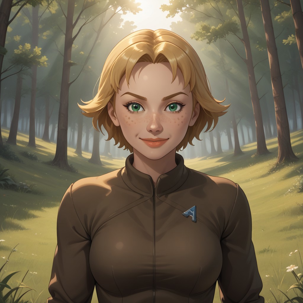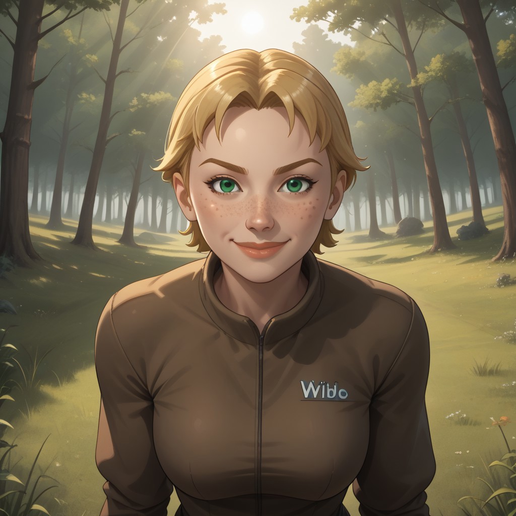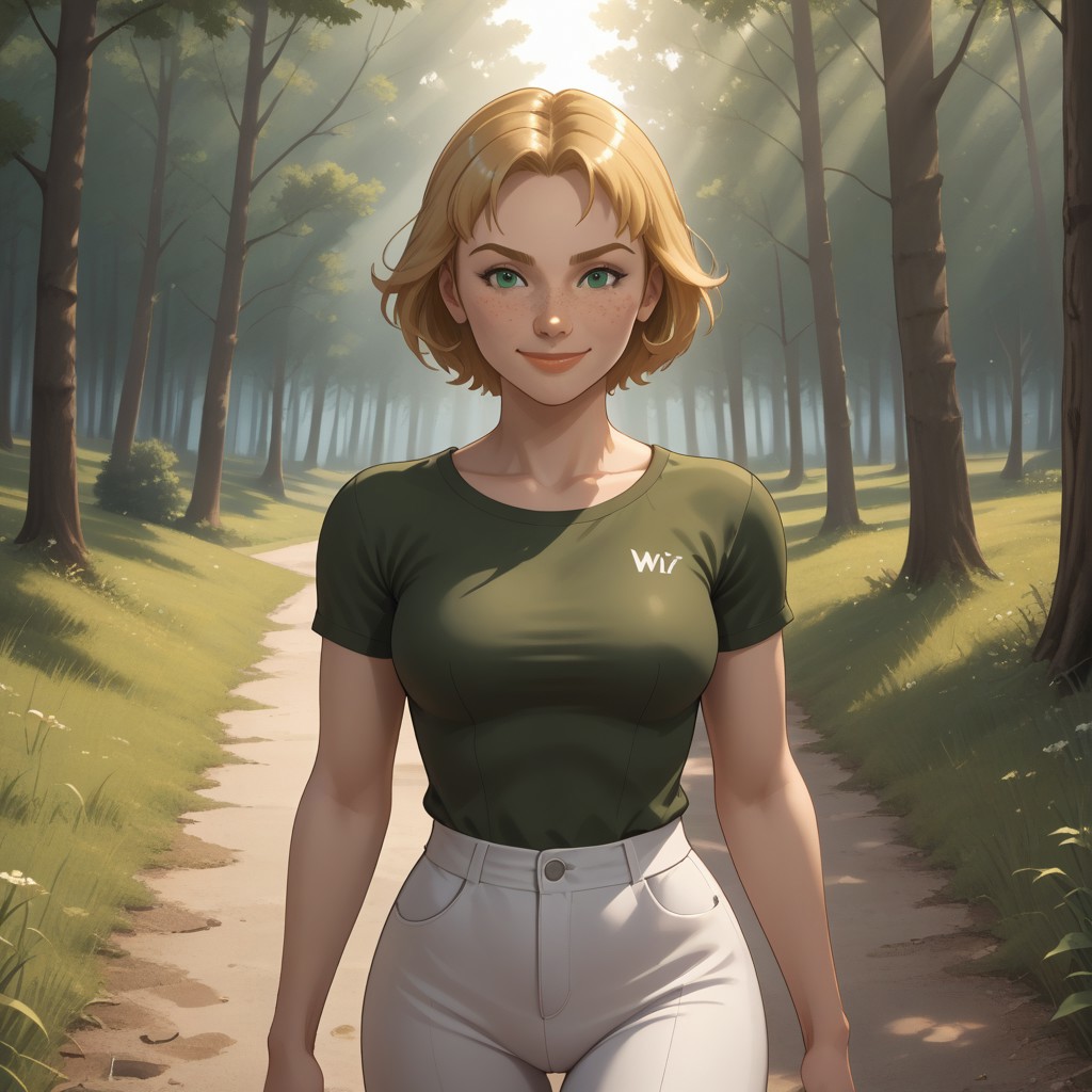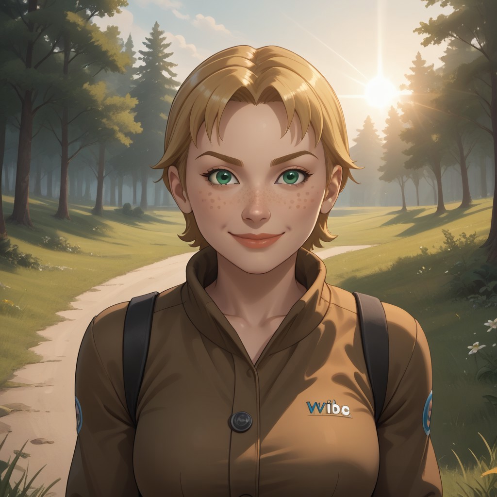 wii, mii, wii sports, 1girl, cute, female mii, blonde hair, short hair, dark blonde eyebrows, green eyes, freckles, lips, brown clothing, white pants, shoes, JessieWS, breasts, nintendo mii, modern_mii, classic_mii