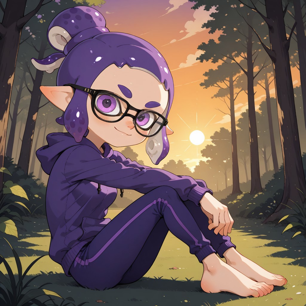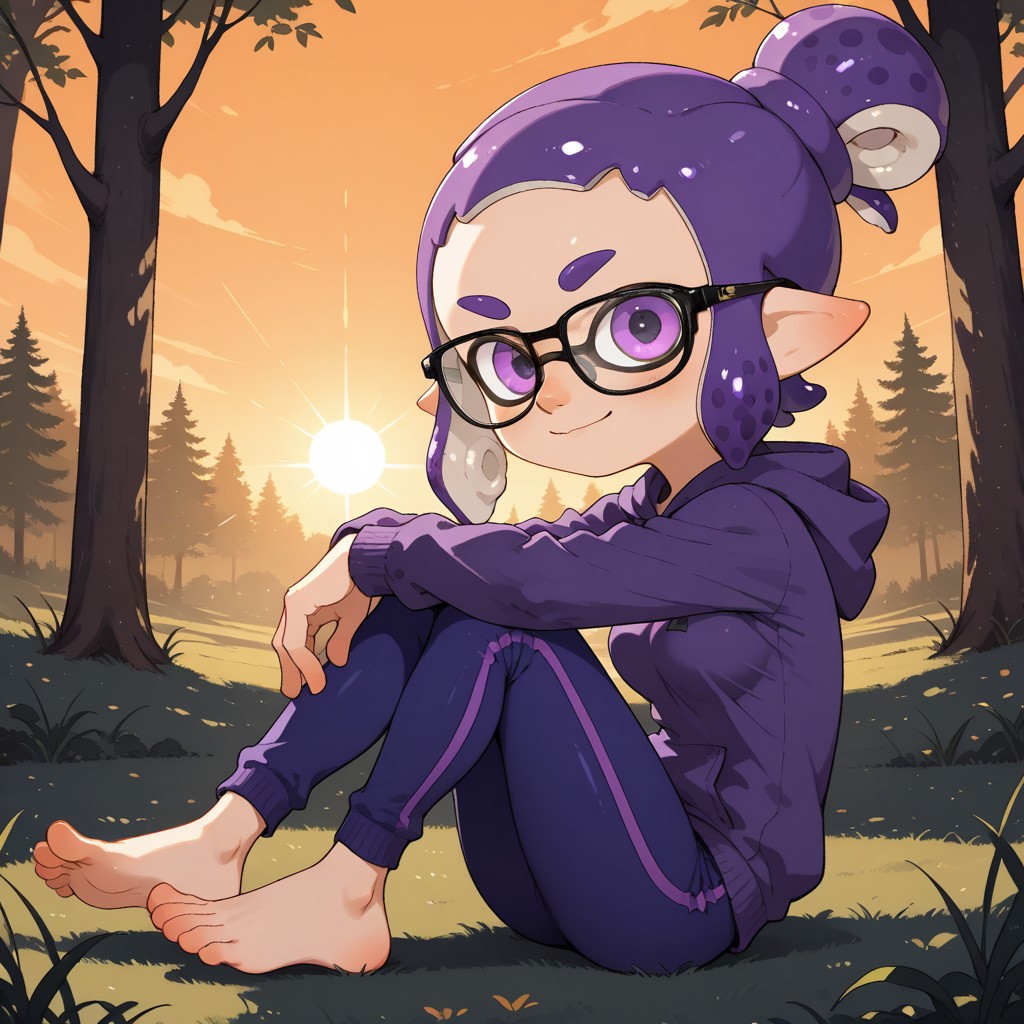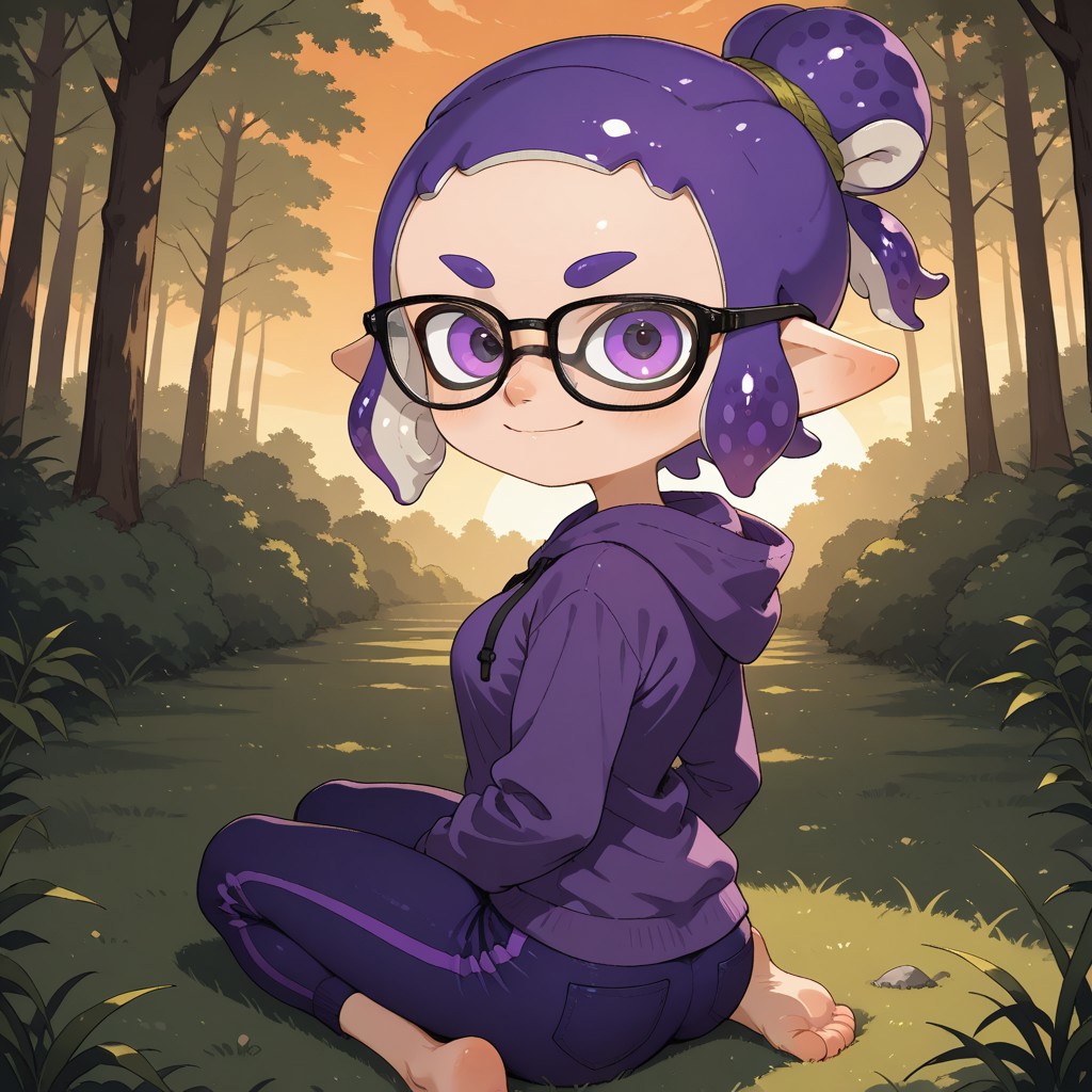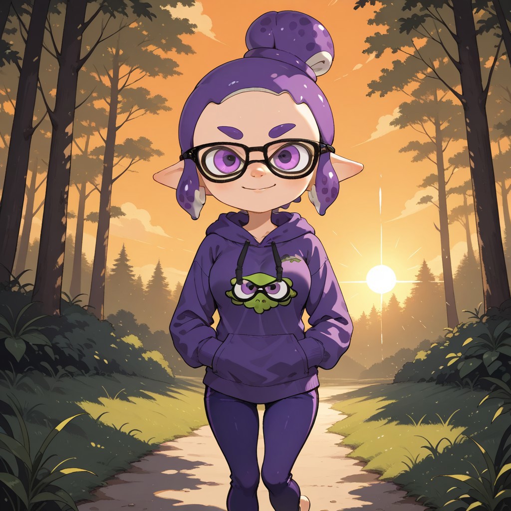 JeanetteOC, splatoon, inkling, female inkling, 1girl, cute, tentacle hair, purple hair, single hair bun, purple eyes, cute eyes, glasses, purple eyebrows, purple hoodie, breasts, purple jeans, blue purple shoes