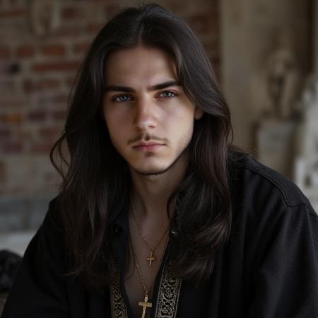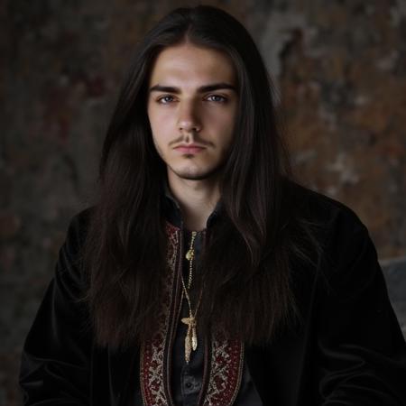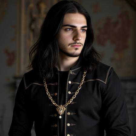 Prince man , long black hair, beard, medieval prince clothes,