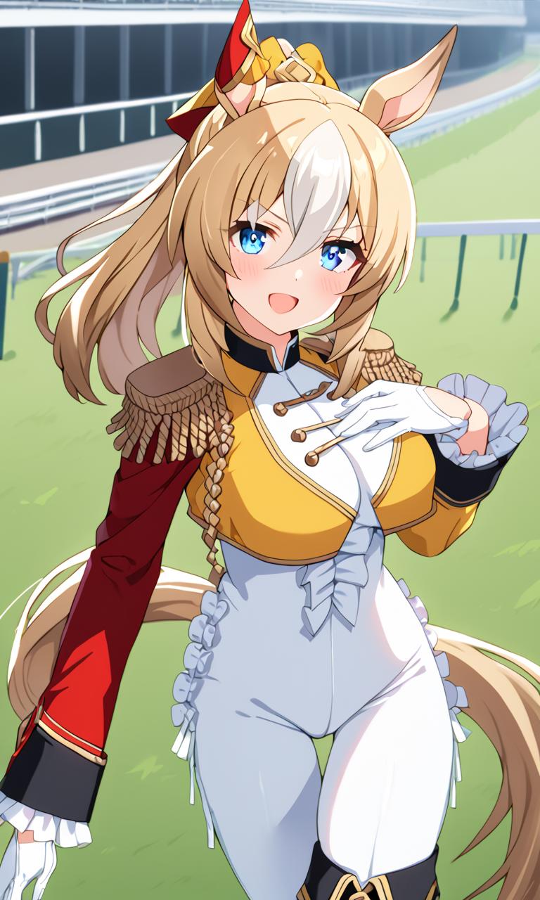 <lora:sdxl-uma-durandal:0.7> Durandal, 1girl, solo, animal ears, horse ears, horse girl, tail, horse tail, long hair, multicolored hair, ponytail, hair between eyes, two-tone hair, white hair, blonde hair, blue eyes, yellow hair bow, medium breasts, skindentation, :D +++ raceuniform, intricate ornament jacket, yellow cropped jacket, asymmetry multicolored long sleeves, epaulettes, white gloves, white pants, black thigh boots, asymmetrical footwear, gold toe, turf, race track