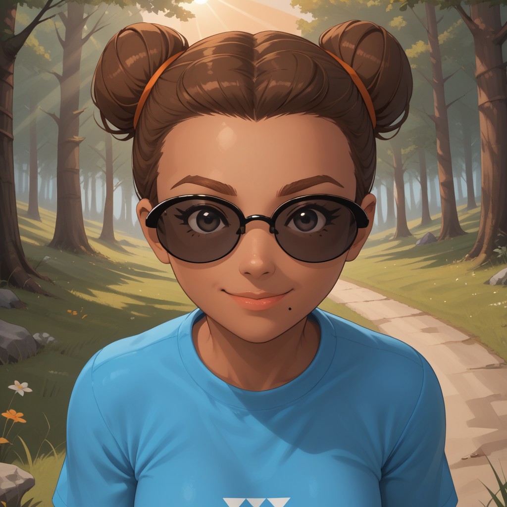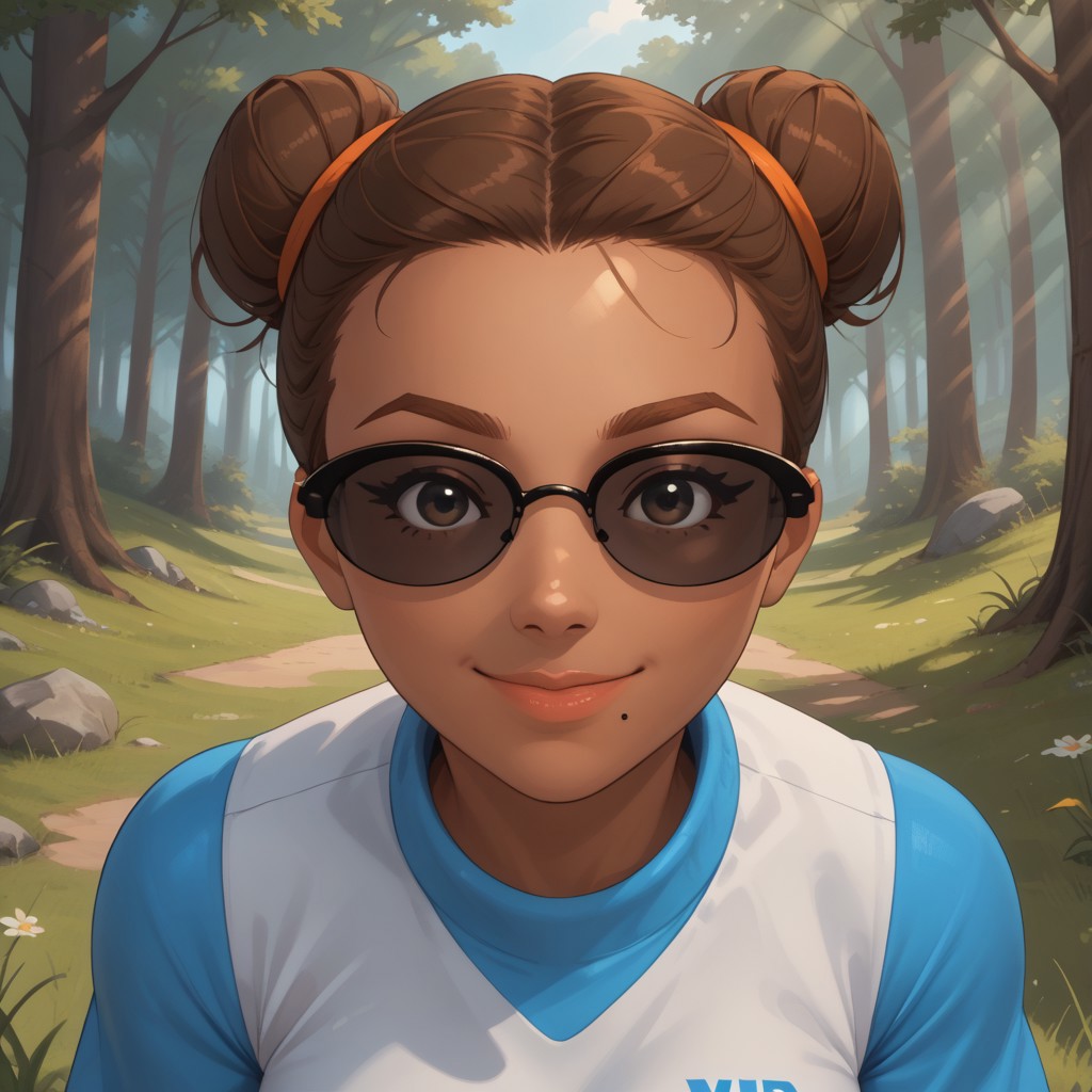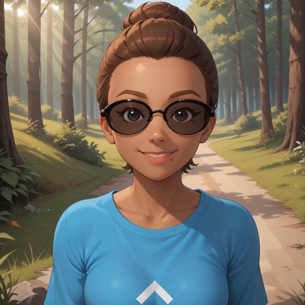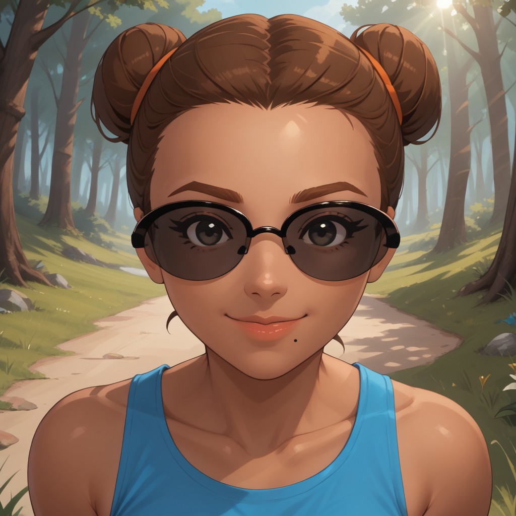 wii, mii, wii sports, 1girl, cute, female mii, dark skin, dark skin female, brown hair, single hair bun, brown eyebrows, black eyes, sunglasses, lips, mole under mouth, cyan clothing, white pants, shoes, GwenWSR, breasts, nintendo mii, modern_mii, classic_mii