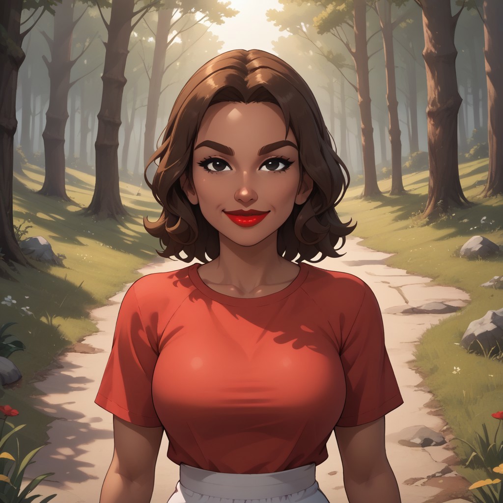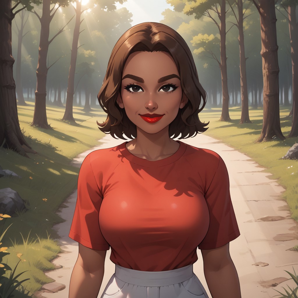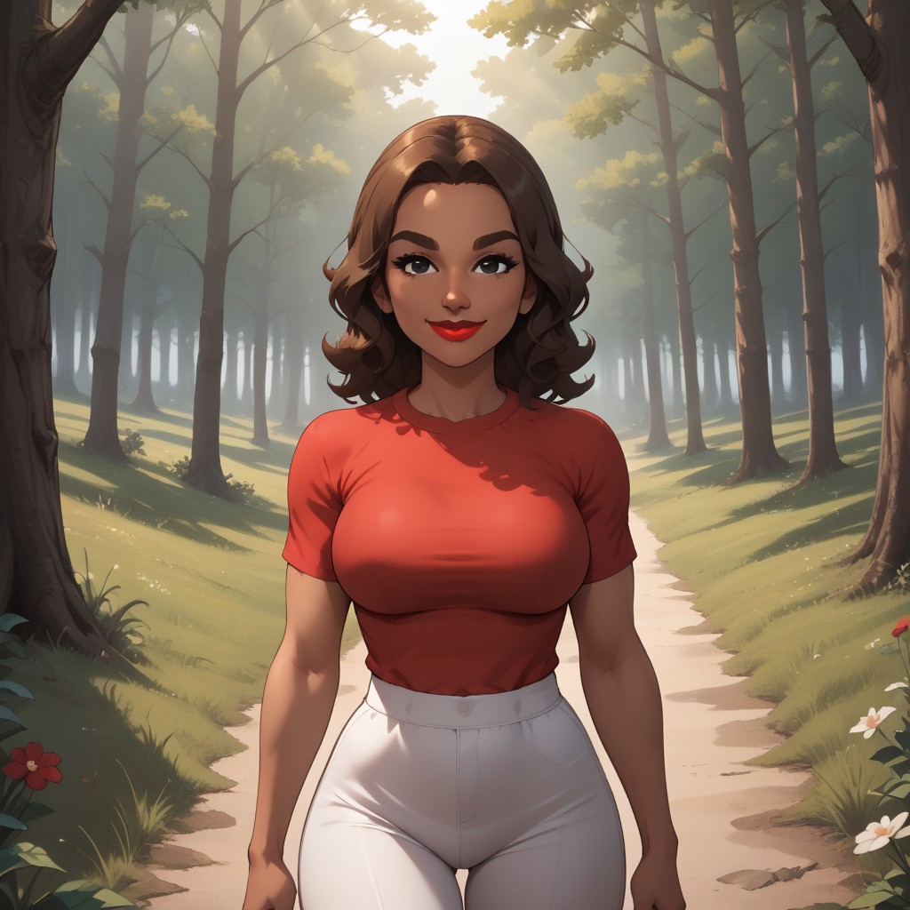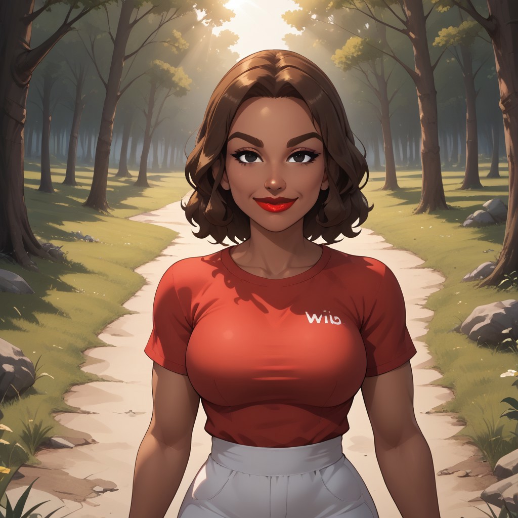 wii, mii, wii sports, 1girl, female mii, dark skin, dark skin female, brown hair, brown eyebrows, black eyes, red lips, lipstick, red clothing, white pants, shoes, HiromiWSC, big breasts, nintendo mii, modern_mii, classic_mii
