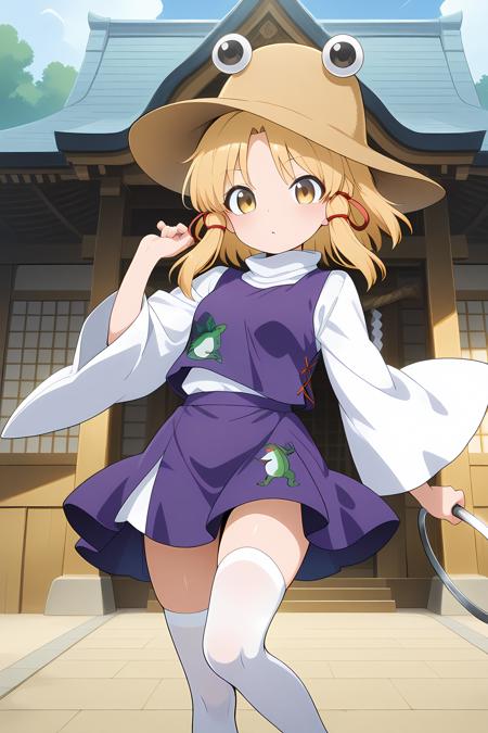 moriya suwako, 1girl, solo, blonde hair, yellow eyes, small breasts