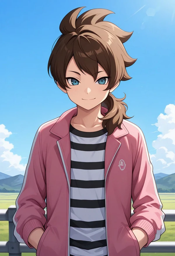 fudoakgo, 1boy, male focus, solo, blue eyes, brown hair, long hair, ponytail, shirt, striped shirt, jacket, pink jacket, open jacket, pants, green pants,