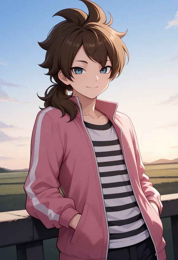 caleb, 1boy, brown hair, long hair, blue eyes, jacket, track jacket, pink jacket, striped shirt, pants, green pants, open clothes,