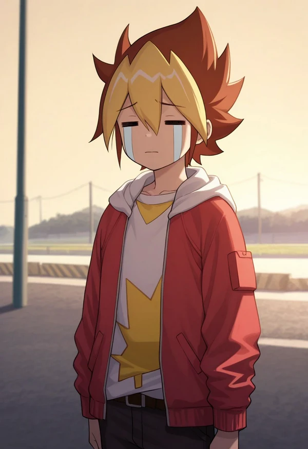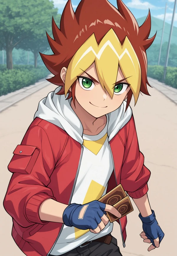 YugaOhdo, 1boy, male focus, solo, green eyes, multicolored hair, brown hair, blonde hair, hair between eyes, shirt, print shirt, jacket, red jacket, hood, gloves, blue gloves, fingerless gloves, belt, shorts, black shorts, shoes, sneakers,