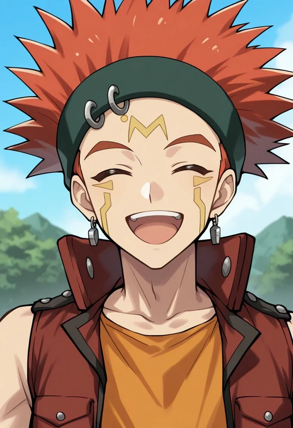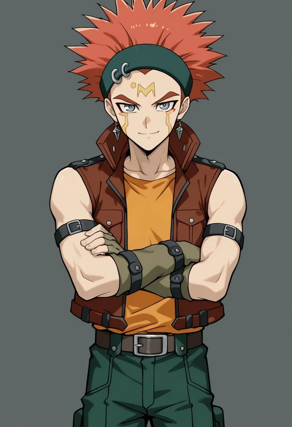 crw_5d, 1boy, male focus, solo, grey eyes, orange hair, spiked hair, headband, jewelry, earrings, facial mark, shirt, orange shirt, sleeveless, jacket, brown jacket, sleeveless jacket, open jacket, open clothes, arm belt, gloves, fingerless gloves, belt, pants, green pants, boots,