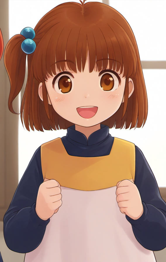 PuyoArleYH,1girl,solo,brown hair,brown eyes,hair bobbles, yellow collar, kindergarten uniform,smile,blue skirt,blue boots