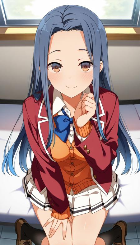 school uniform,red jacket,blazer,orange cardigan,blue bowtie,white shirt,collared shirt,dress shirt,long sleeves,medium breasts,skindentation,miniskirt,white skirt,pleated skirt,black socks,loafers,brown footwear