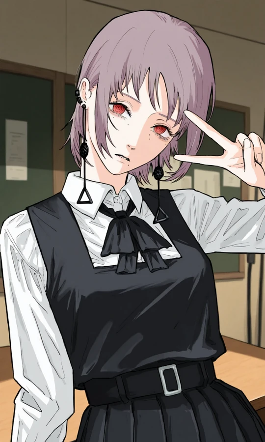 fami \(chainsaw man\), 1girl, short hair, tassel earrings, ringed eyes, goodearrings