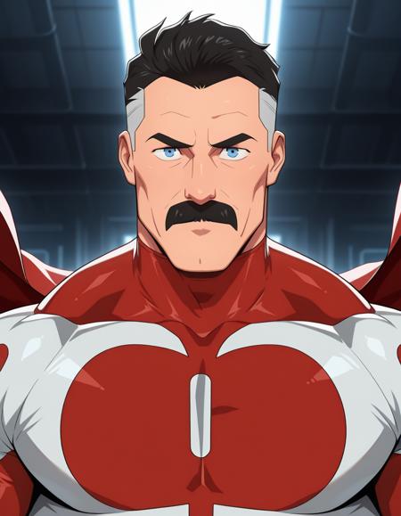 OmnimanIL, 1boy, black hair, short hair, blue eyes, male focus, mature male, mustache, muscular