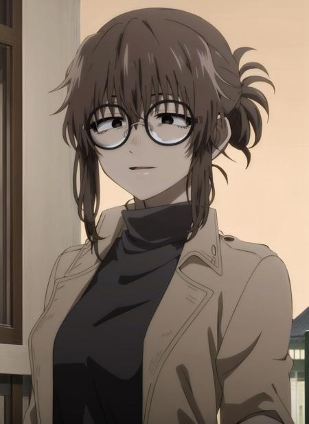 Prompts: uguisu_anko, black eyes, glasses, round eyewear, brown hair, folded ponytail, turtleneck sweater, black sweater, trench coat, brown coat, open coat, black skirt, pencil skirt, medium skirt, ankle boots, brown footwear