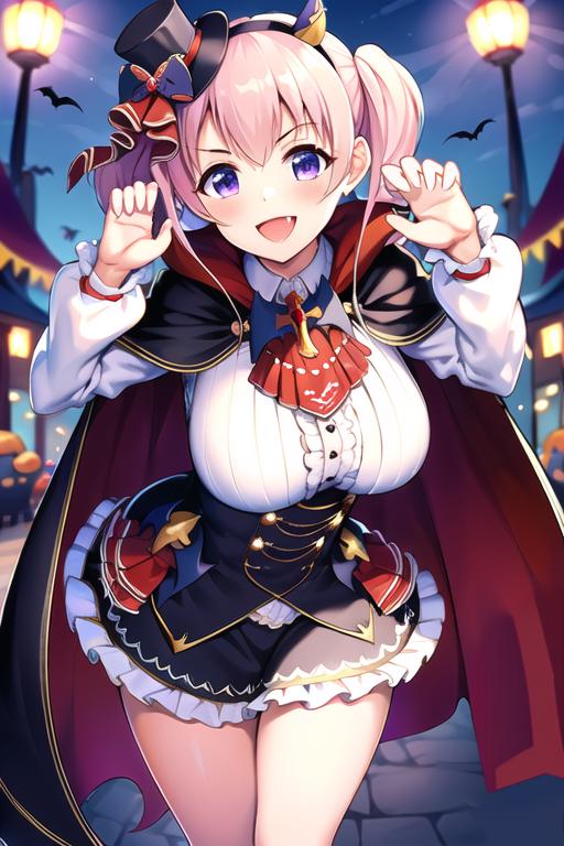 tsumugivamp, two-sided fabric, 1girl, two-sided cape, vampire costume, red cape, mini hat, pink hair, bangs, black cape, black headwear, purple eyes, skirt, twintails, red ascot, top hat, long hair, white shirt, mini top hat, fang, frills, black corset, large breasts, frilled skirt, collared shirt, long sleeves, fake horns,