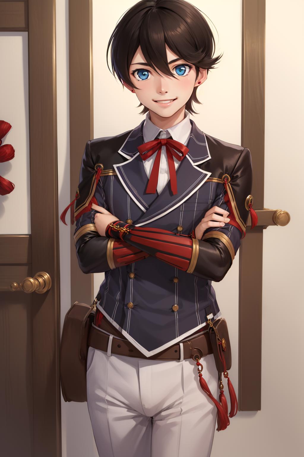 https://civitai.com/models/92275/kunihiro-horikawa-or-touken-ranbu Weight: 1.0 Default Outfit: japanese armor, double-breasted, buttons, jewelry, stud earrings