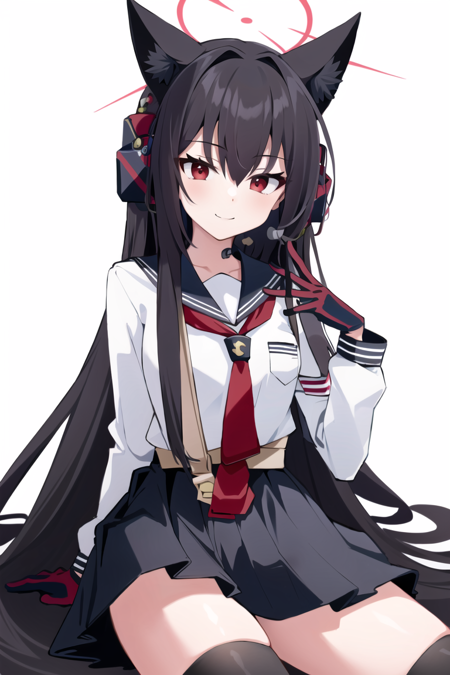 shichido yukino long hair black hair red eyes long sleeves animal ears hair between eyes pleated skirt necktie serafuku black thighhighs headphones halo two-tone gloves