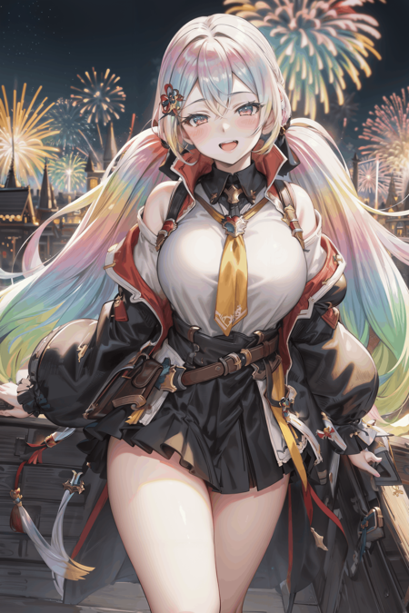 1girl cupitan \(granblue fantasy\) large breasts thighs multicolored hair multicolored eyes gradient hair twintails bangs low twintails very long hair