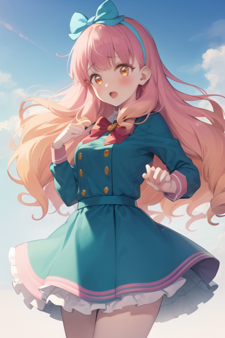 (multicolored_hair, pink_hair), blue_hairband, side_bow, blunt_bangs, gradient_hair, hair_bow, hairband, , orange_eyes, (aqua_school_uniform, aqua_dress) , long sleeves, red_bow, six buttons
