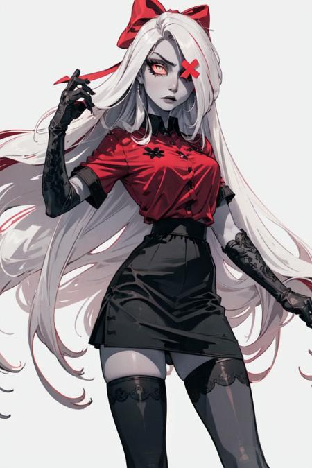 https://civitai.com/models/110211/vaggie-hazbin-hotel Vaggie from Hazbin Hotel This model is able to create her Pilot outfit and her new Hazbin Hotel uniform. Trigger: Vaggie Pilot Outfit: (Casual Outfit), (white dress, striped stockings, hair bow) Uniform Outfit: (Hotel Outfit), (red shirt, black skirt, stockings, gloves, hair bow) Additional: (grey/gray skin, white hair, pink sclera, yellow pupils, long hair) Lora weights: 0.6-09 See the author's site for details.