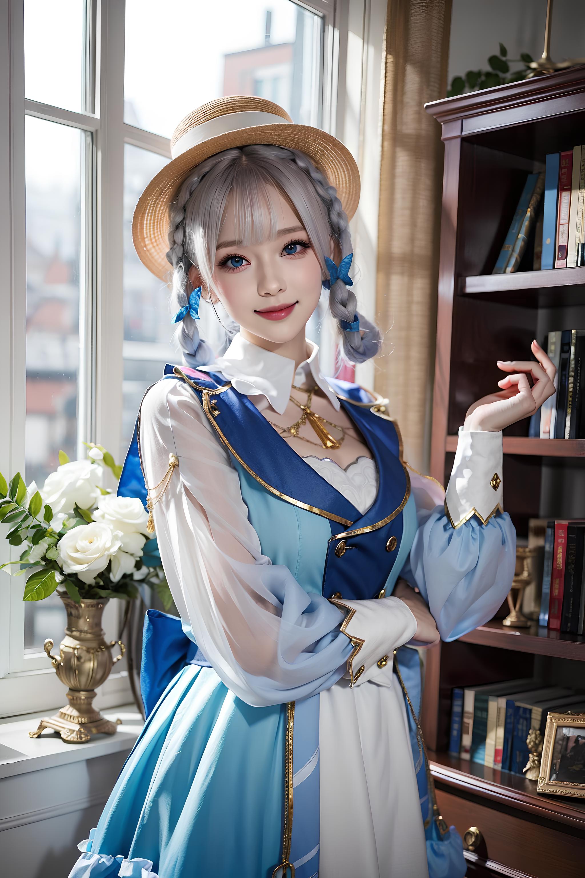 kamisato_ayaka 1girl beautiful face blue hair blue eyes braid hat blue dress white pantyhose brown boots