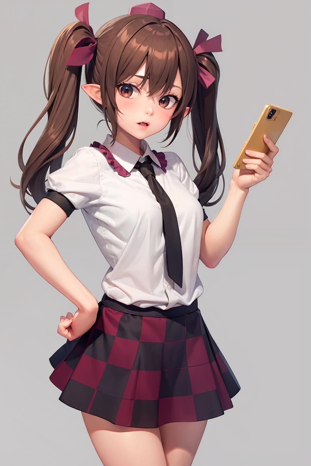 https://civitai.com/models/122162/miike-naekodetective-conan Trigger Words:: himekaidou hatate, 1girl, tokin hat, pointy ears, brown hair, brown eyes, twintails, ribbon, necklace, short sleeves, shirt, checkered skirt, tengu-geta,