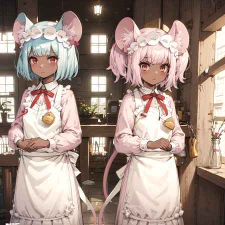 two anime mouse girls dressed in pink with aprons standing in front of building dark-skinned female dark skin animal ears red eyes apron indoors