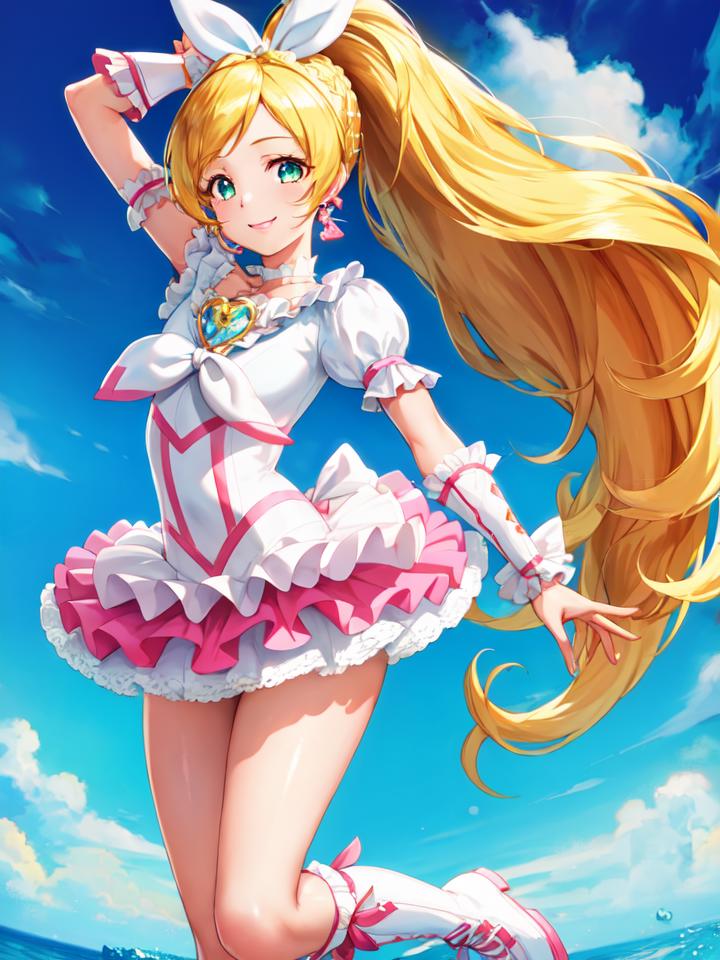 https://civitai.com/models/130530/cure-rhythm-suite-pretty-cure Trigger Tag: cure rhythm Recommend Tags: wide ponytail, puffy short sleeves, brooch, heart earrings, ribbon, arm warmers, white boots