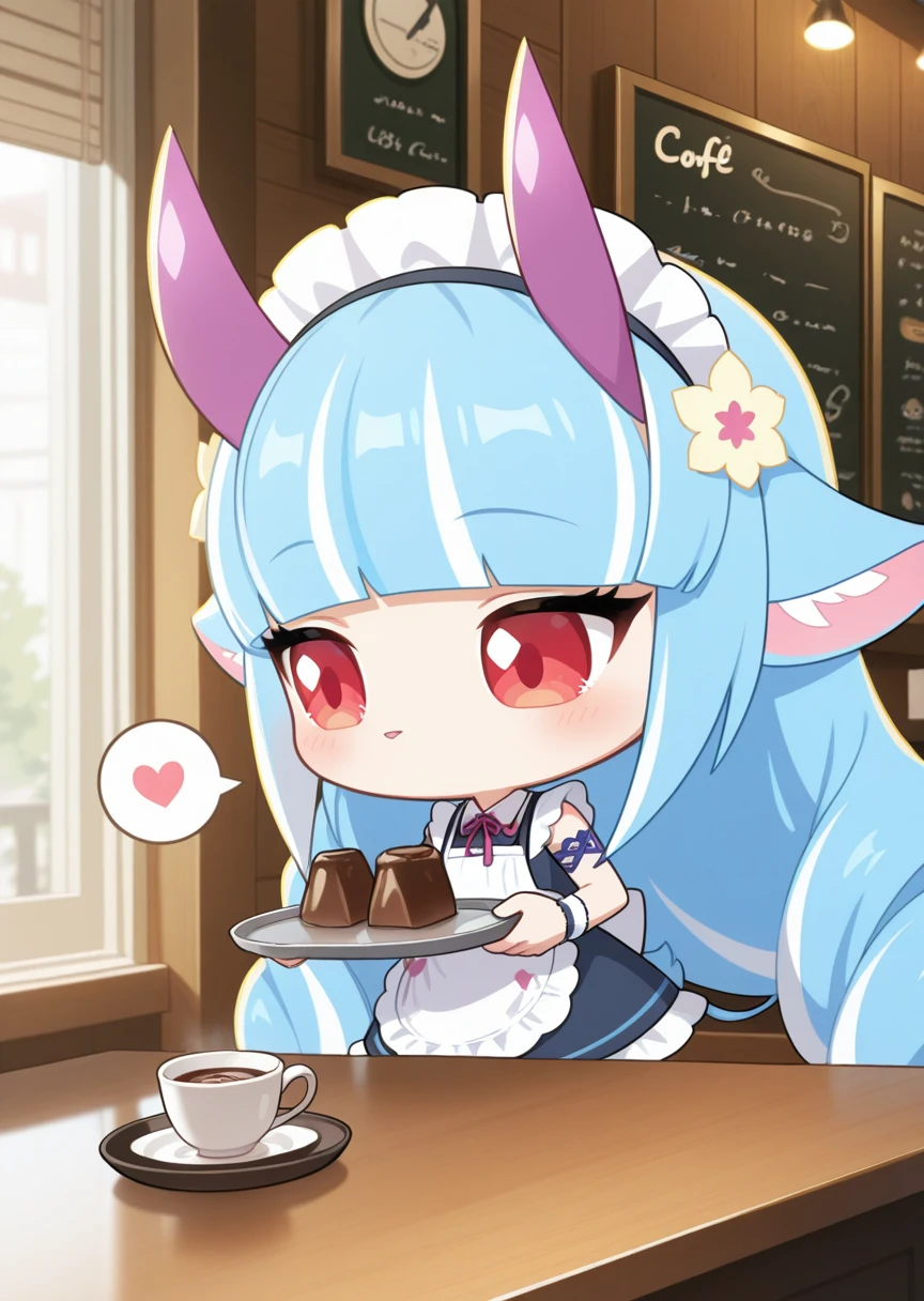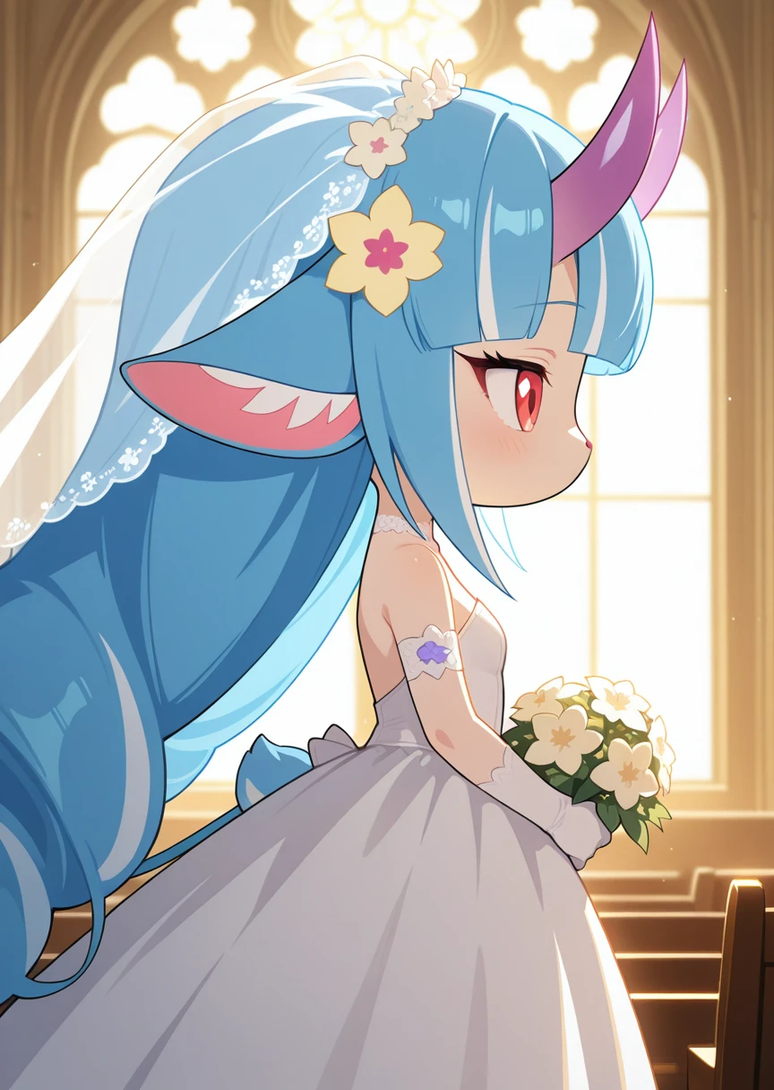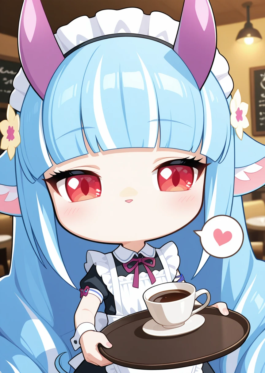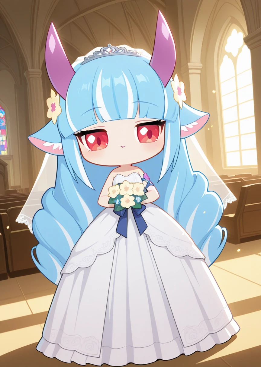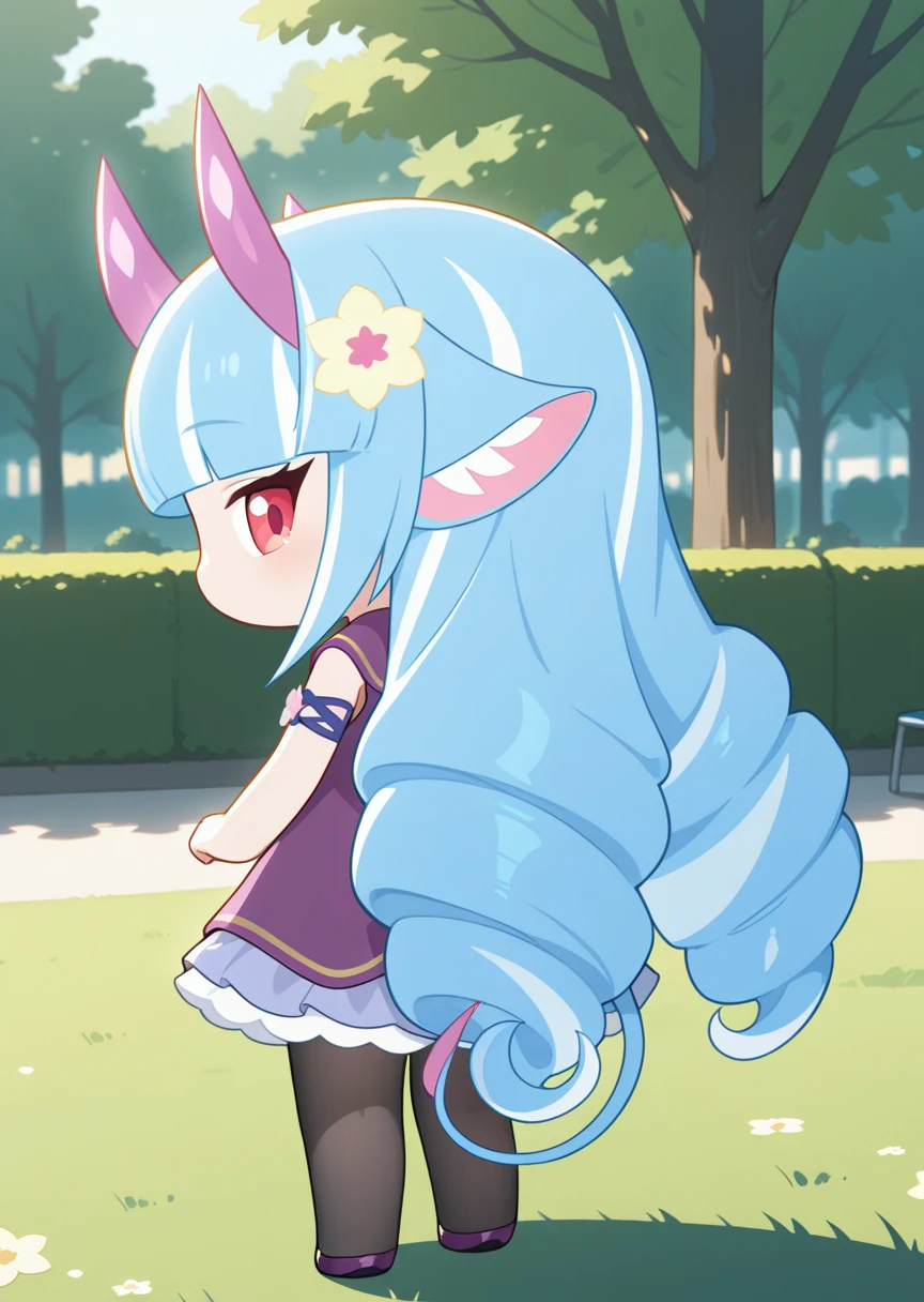 Prompts: delminsb, furry, animal ears, blue hair, purple dress, black legwear, multicolored hair, flower hair accessory, arm accessory, purple horns, red eyes, white hair, no mouth, tail, long hair,