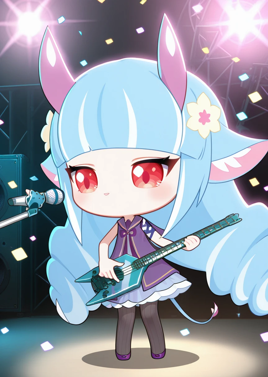 delminsb, furry, animal ears, blue hair, purple dress, black legwear, multicolored hair, flower hair accessory, arm accessory, purple horns, red eyes, white hair, no mouth, tail, long hair,