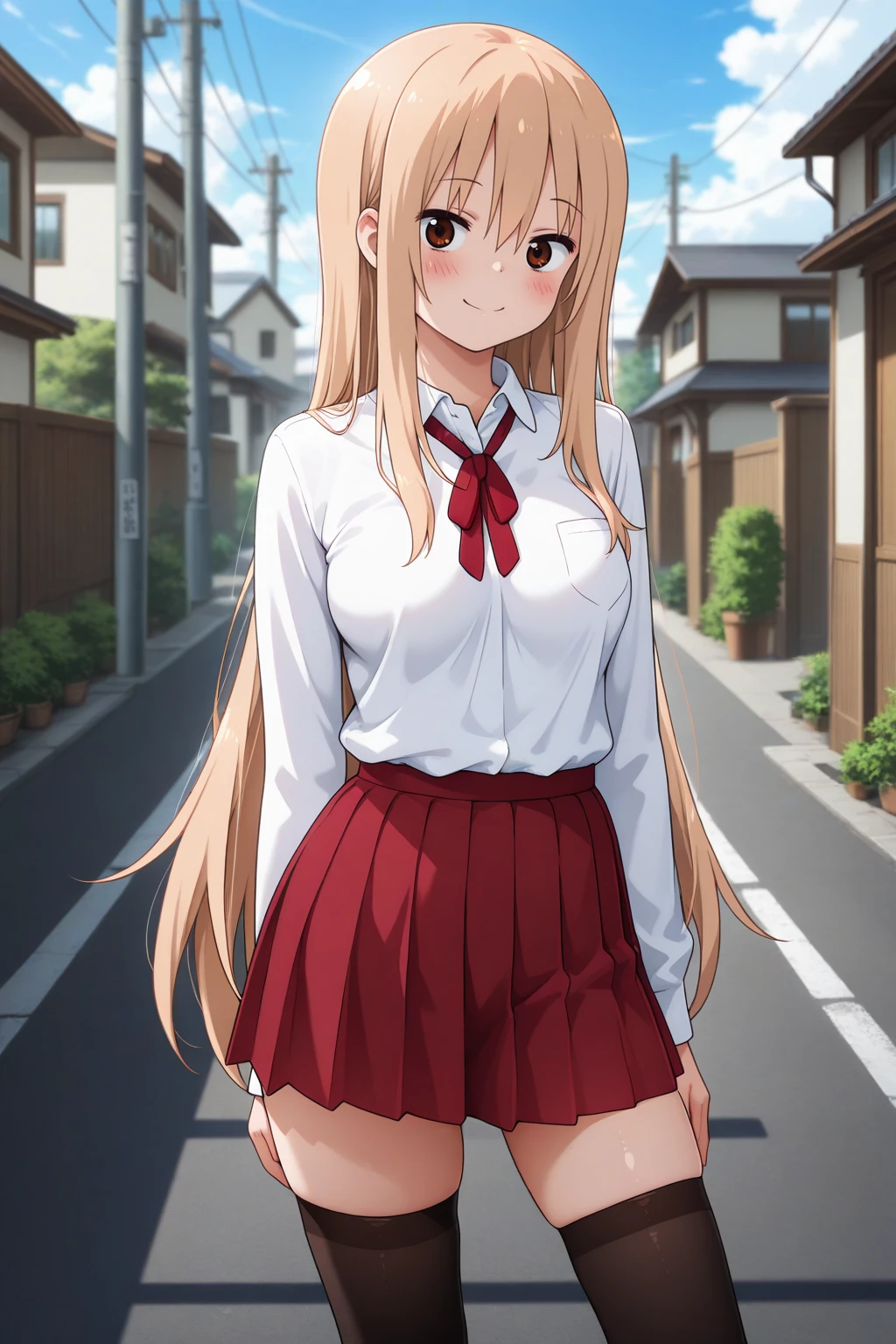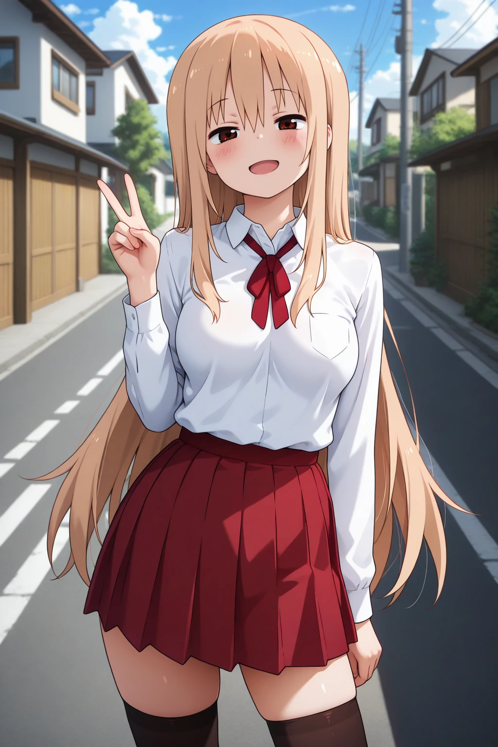 white shirt, collared shirt, red ribbon, neck ribbon, long sleeves, red skirt, pleated skirt, black thighhighs, zettai ryouiki, school uniform,