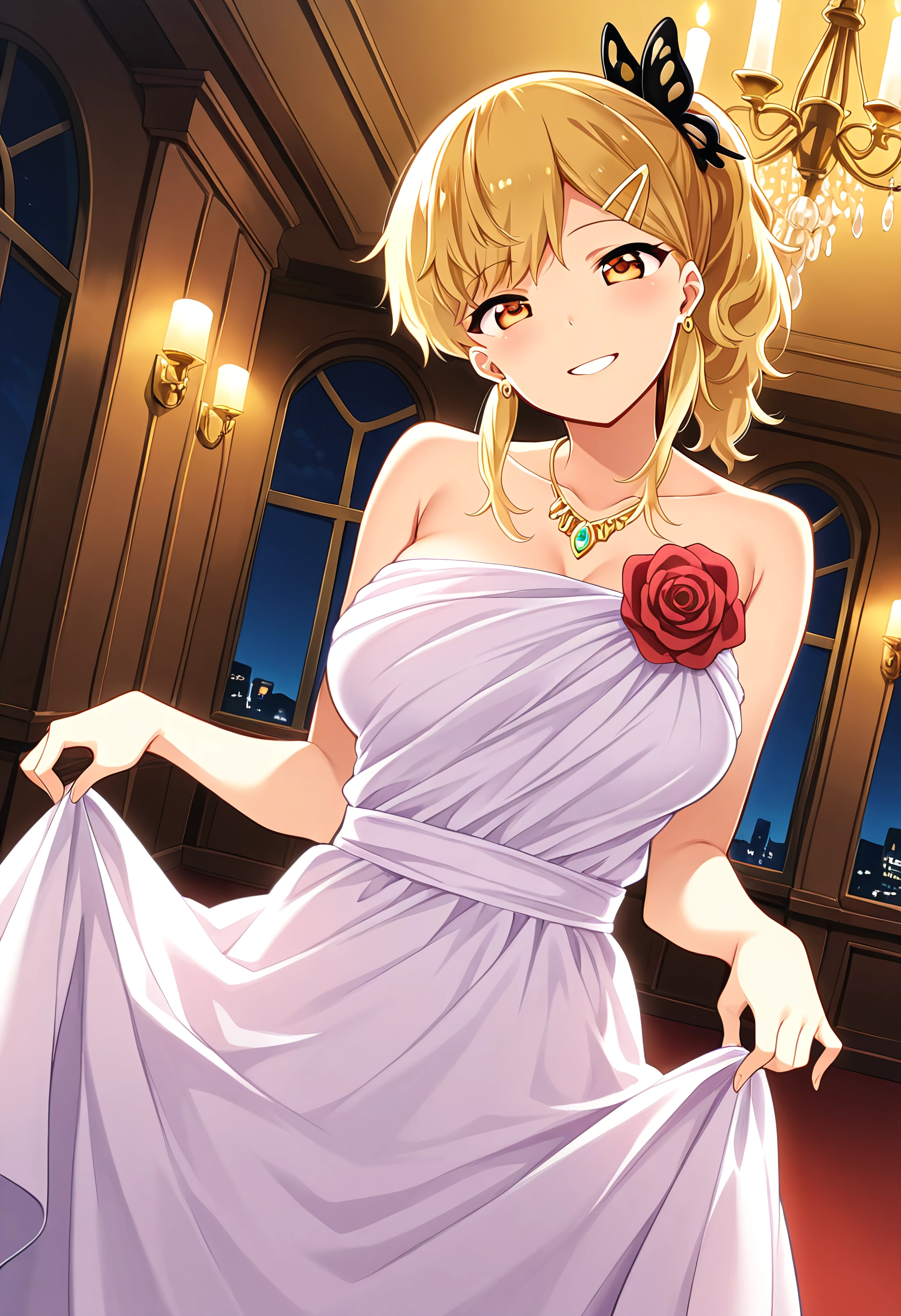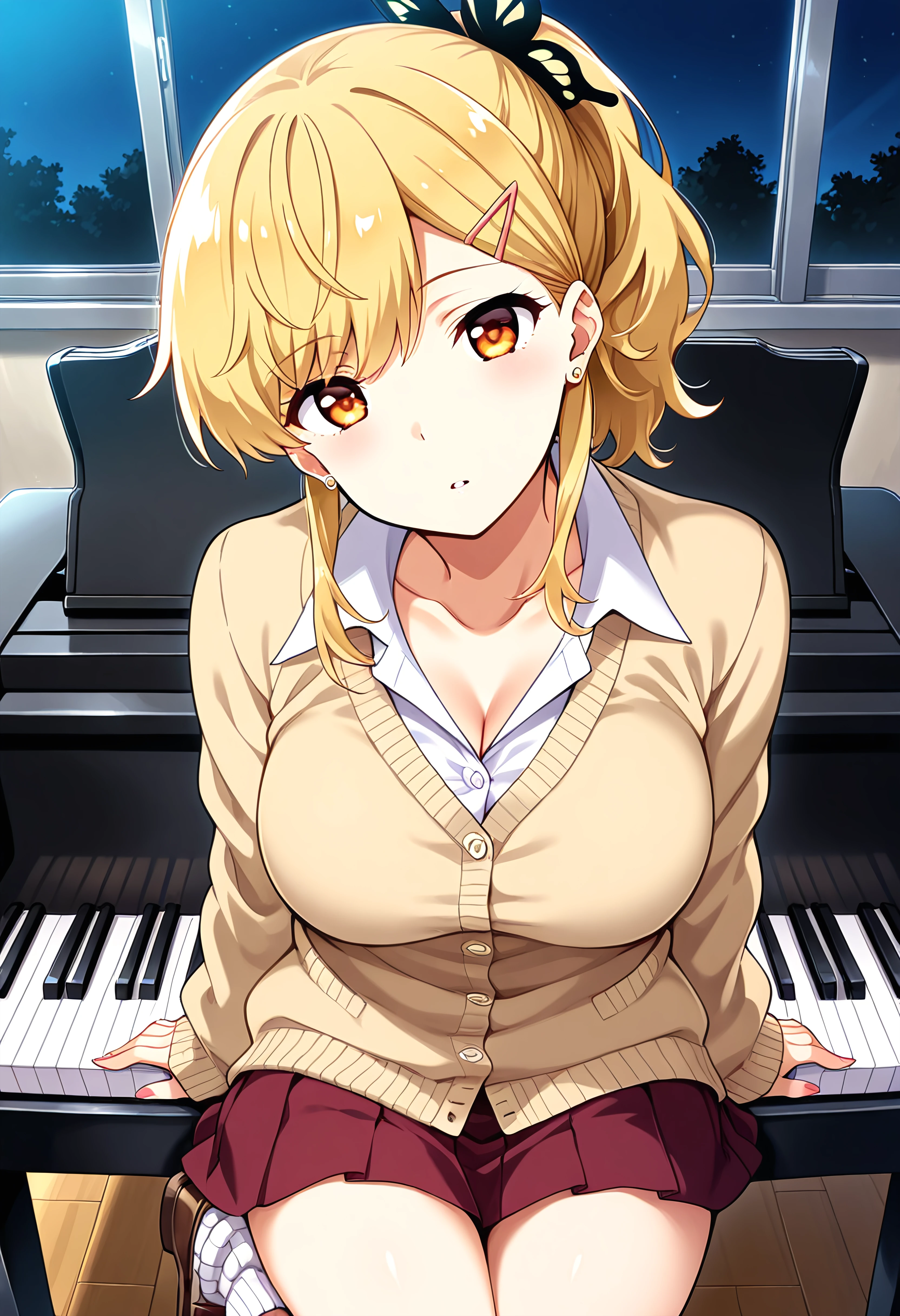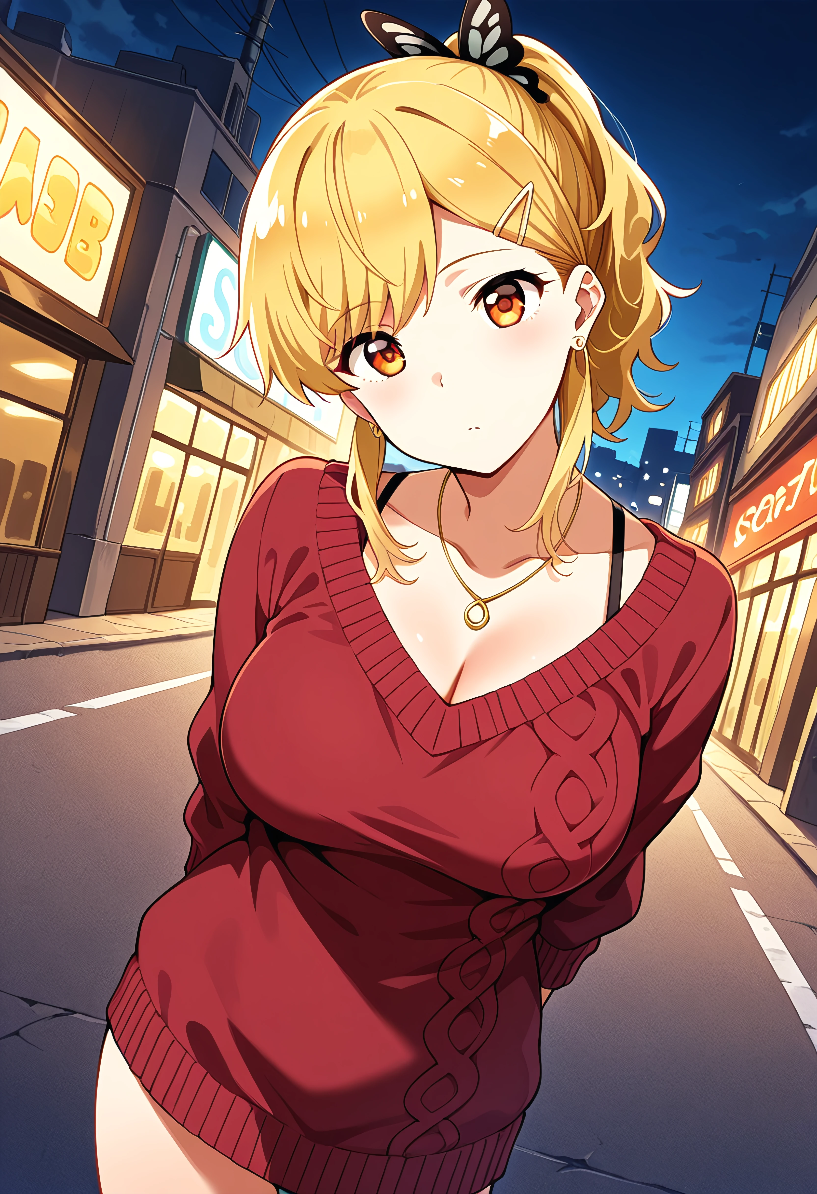 Prompt: NakanomoriKyouko, 1girl, black butterfly hair ornament, hairclip, earrings, amber eyes, blonde hair, hairclip, ponytail, earrings