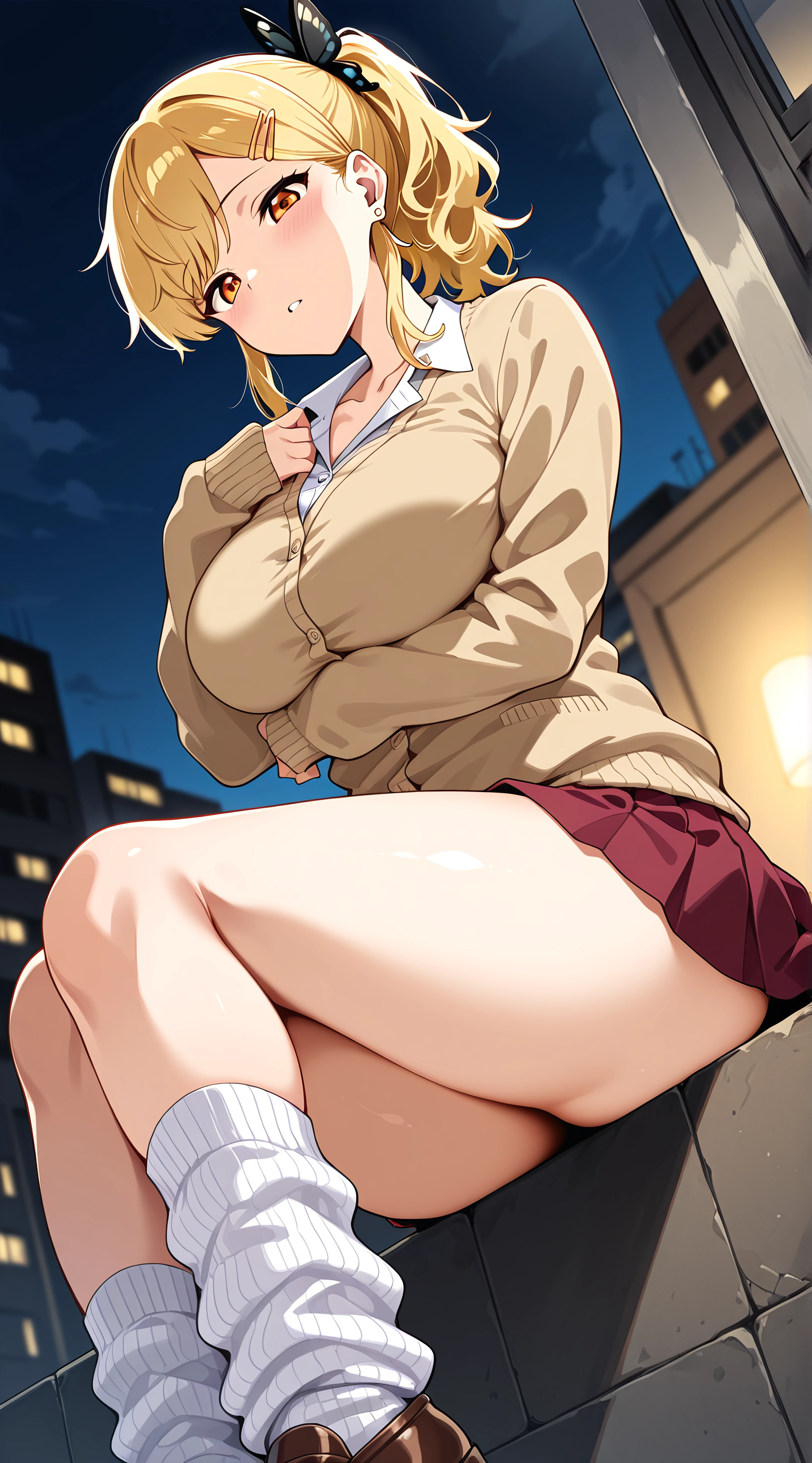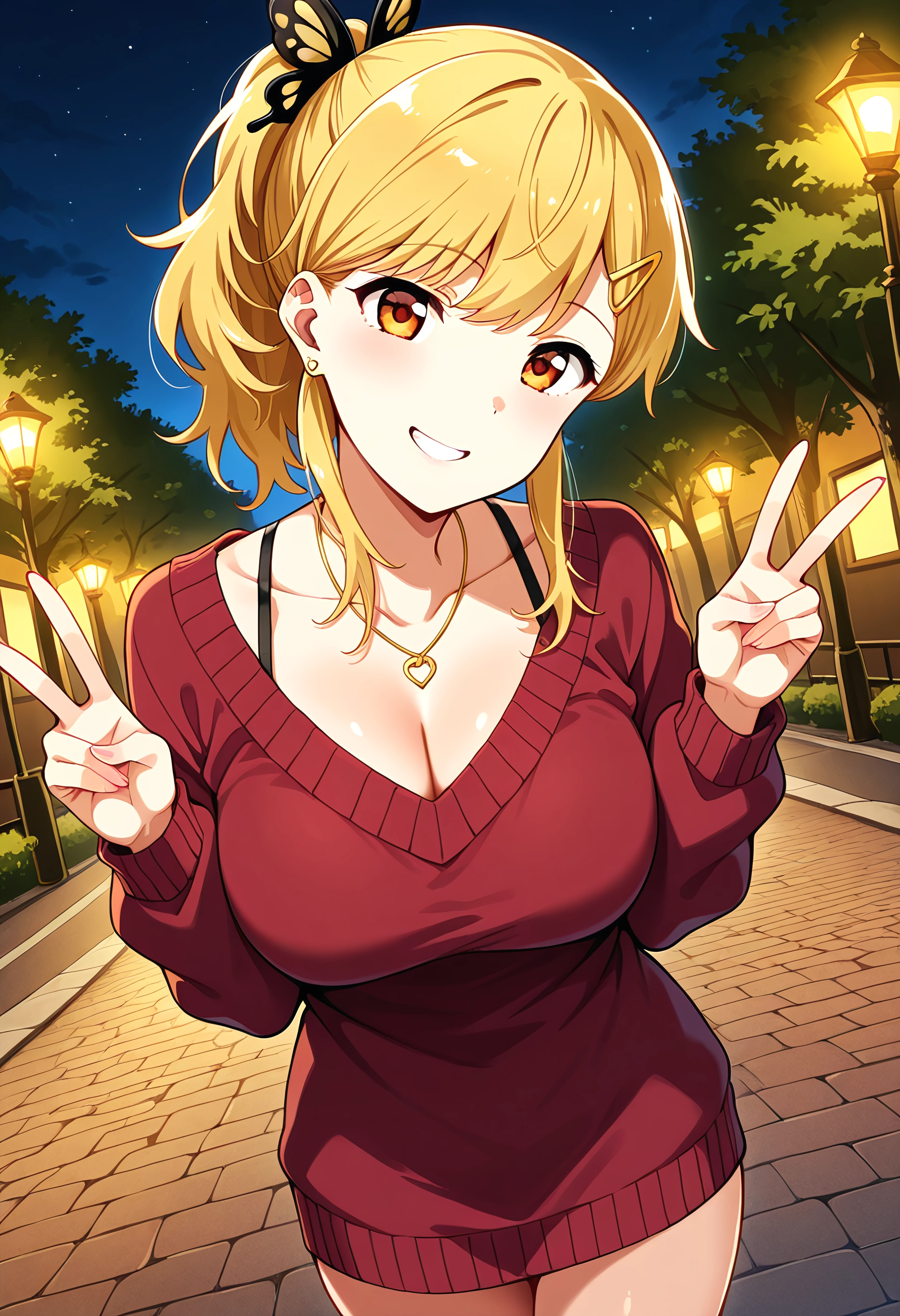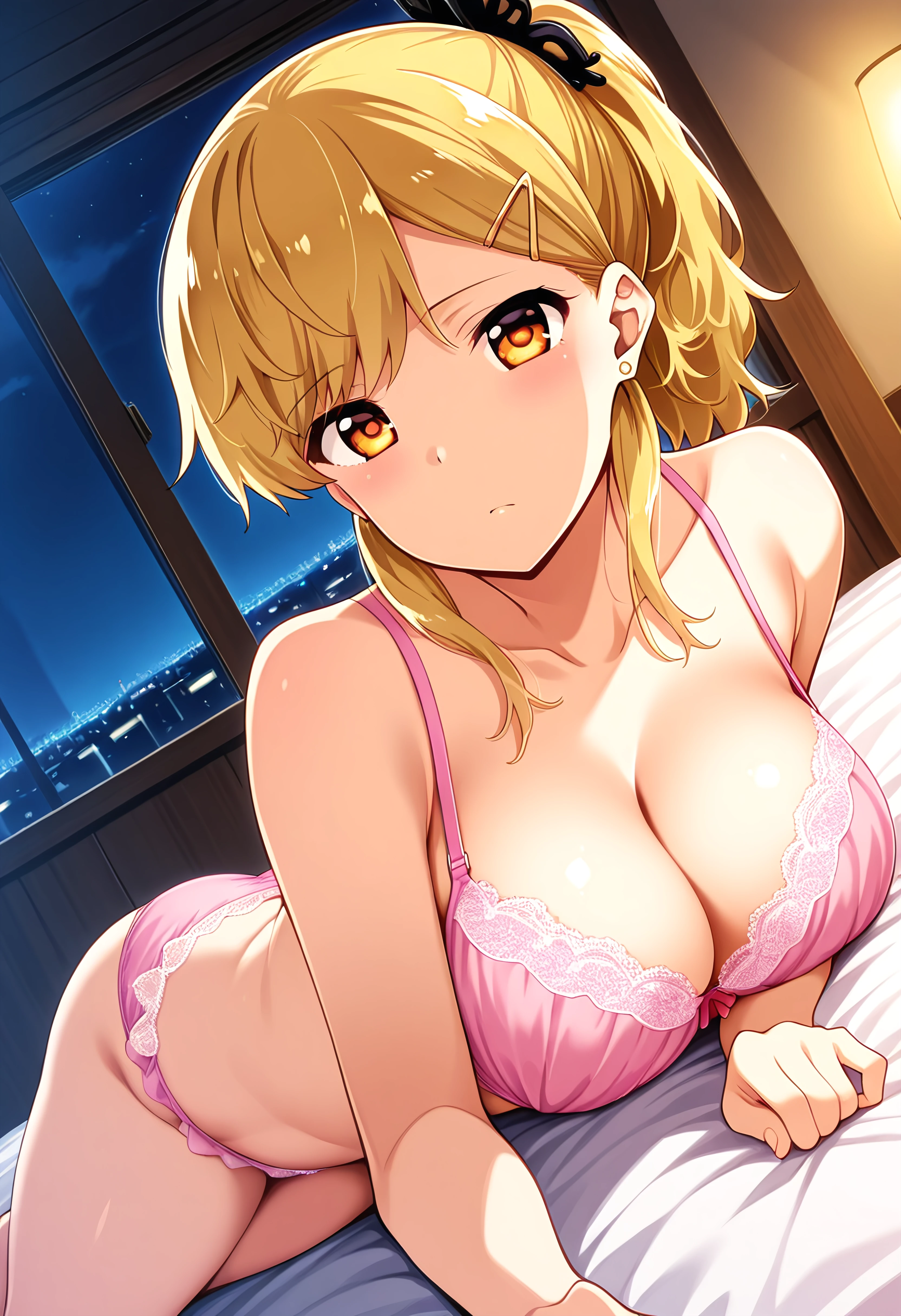 Prompt: NakanomoriKyouko, 1girl, black butterfly hair ornament, hairclip, earrings, amber eyes, blonde hair, hairclip, ponytail, earrings