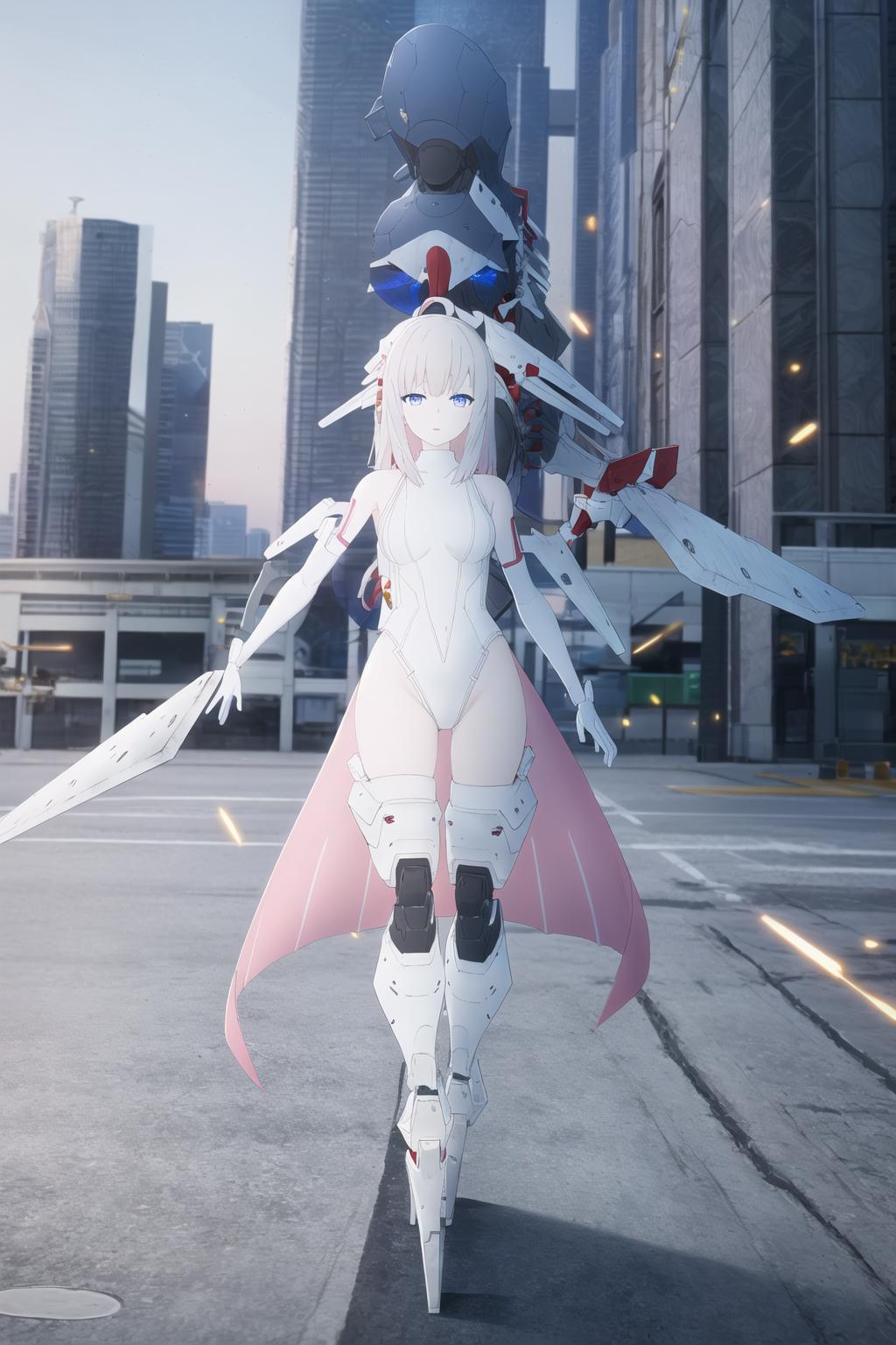 lunatic \(combat\), 1girl, scenery, solo, looking at viewer, blue eyes, outdoors, white hair, science fiction, sky, drone, mecha, robot, mechanical legs, leotard