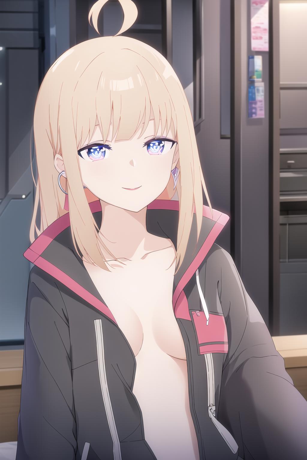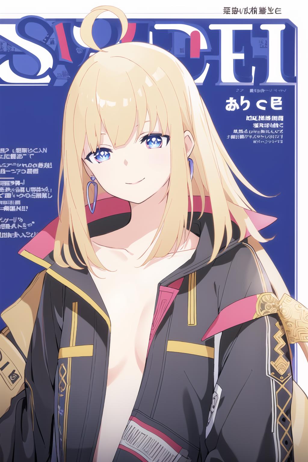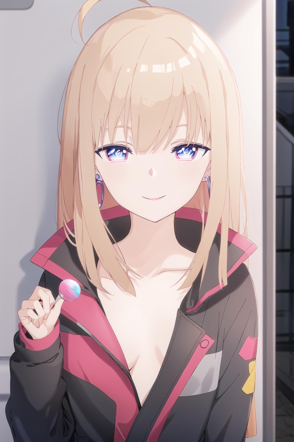 lunatic \(casual\), 1girl, solo, food, lollipop, earrings, holding, long hair, jewelry, bangs, candy, holding food, jacket, looking at viewer, long sleeves, collarbone, holding candy, open clothes, ahoge, upper body, open jacket, black jacket, blue eyes, holding lollipop, blonde hair, smile, blunt bangs, shiny hair, closed mouth, straight hair, no bra