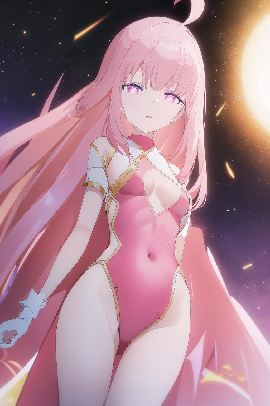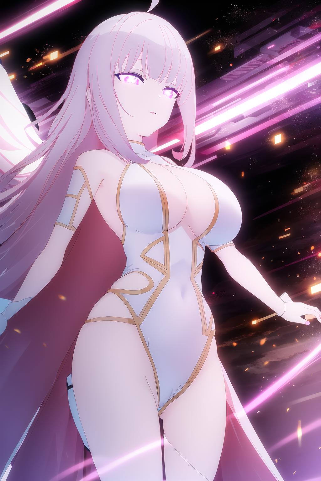 lunatic \(br\), 1girl, solo, ahoge, glowing eyes, sky, glowing, looking at viewer, purple eyes, cloud, night, bangs, moon, long hair, star \(sky\), leotard