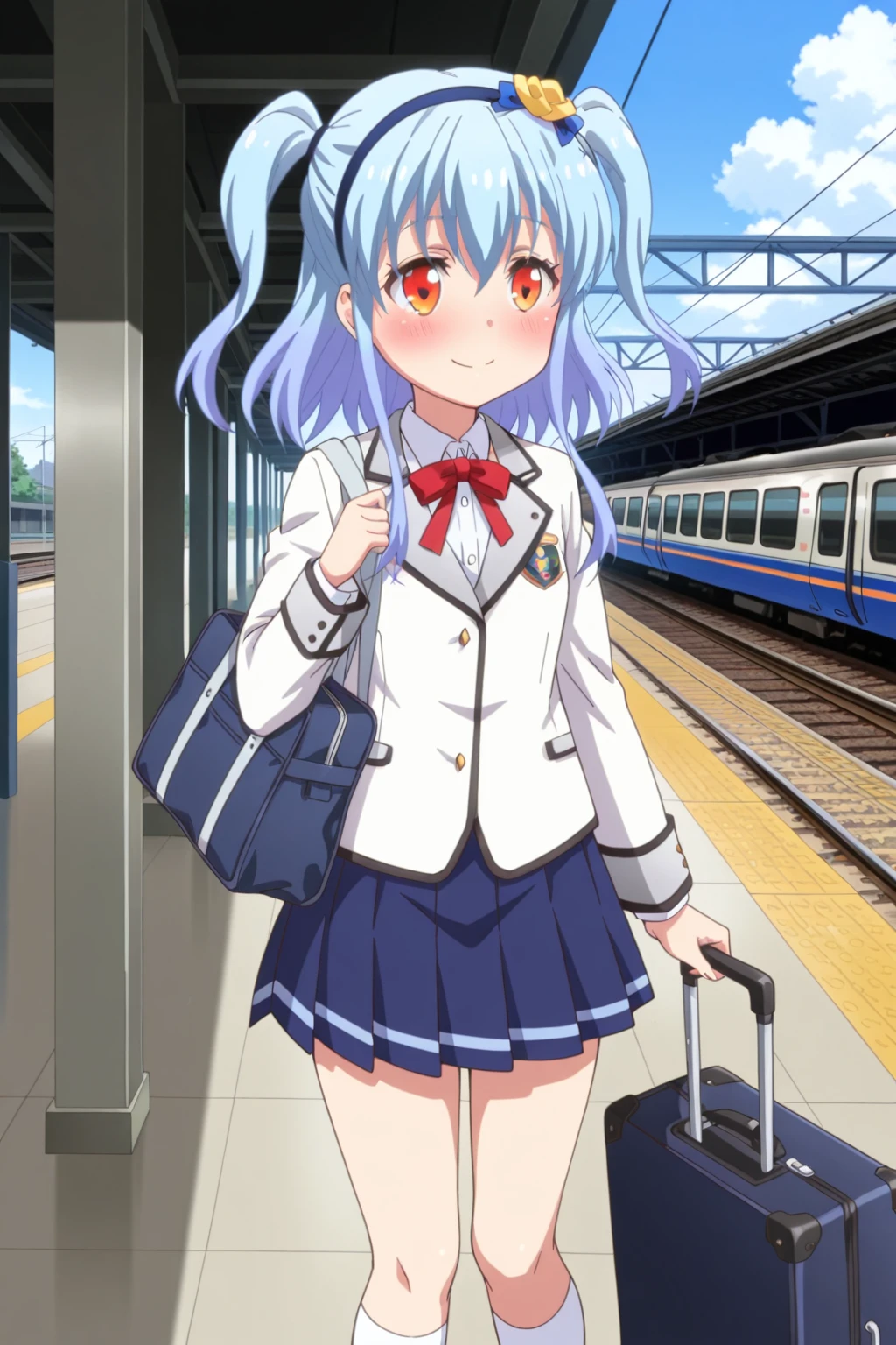 Main Outfit: White school jacket, school uniform, Blue school skirt, white socks, hair band accessory,