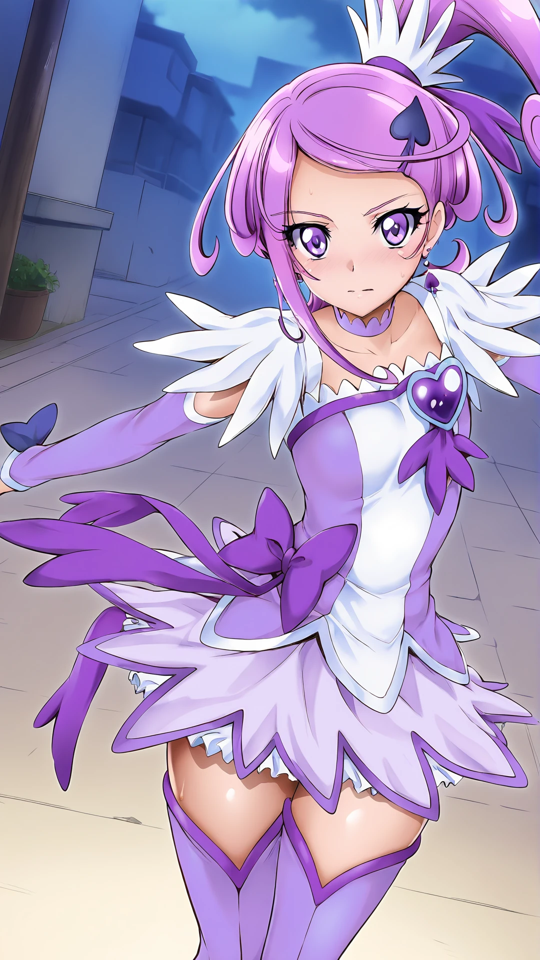 Cyclonemakoto,kenzaki makoto,cure sword,1girl,solo,purple hair,purple eyes,high ponytail,spade hair ornament,hairpin,choker,purple choker,earrings,brooch,heart brooch,purple skirt,thighhighs,thigh boots,purple footwear,arm warmers,magical girl,