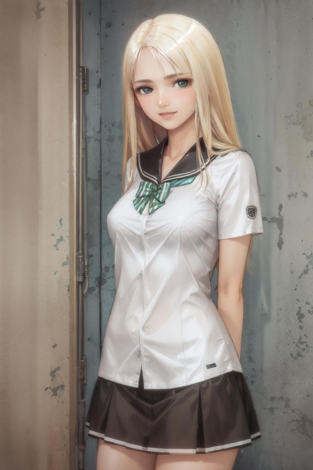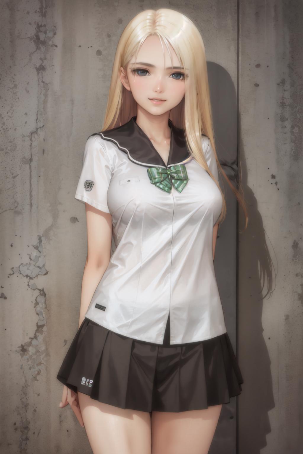 Default Outfit: white serafuku, black sailor collar, short sleeves, black pleated skirt