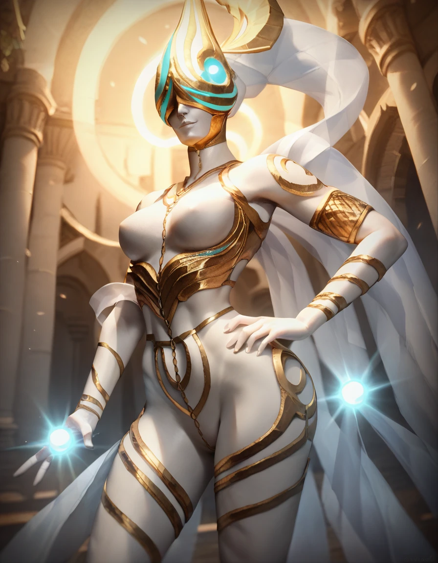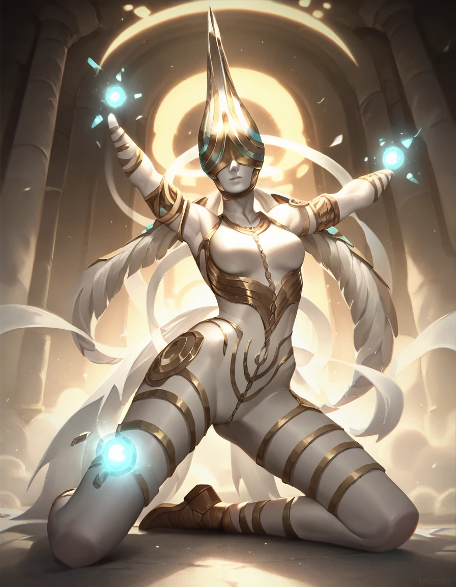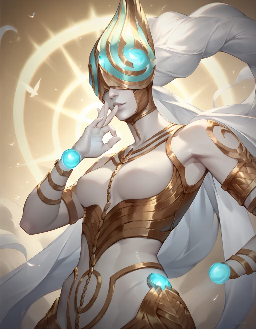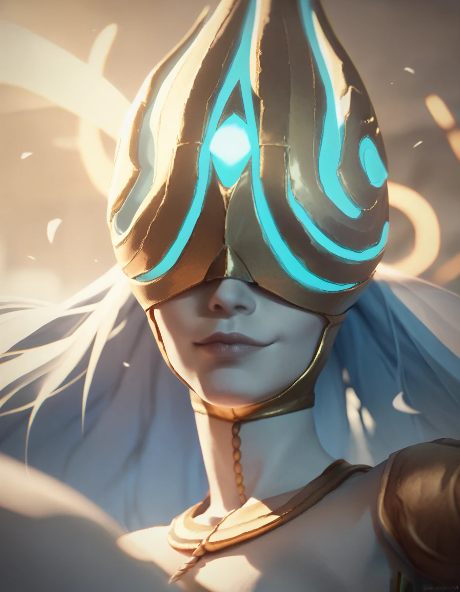 white skin, helmet, covered eyes, light, glowing,