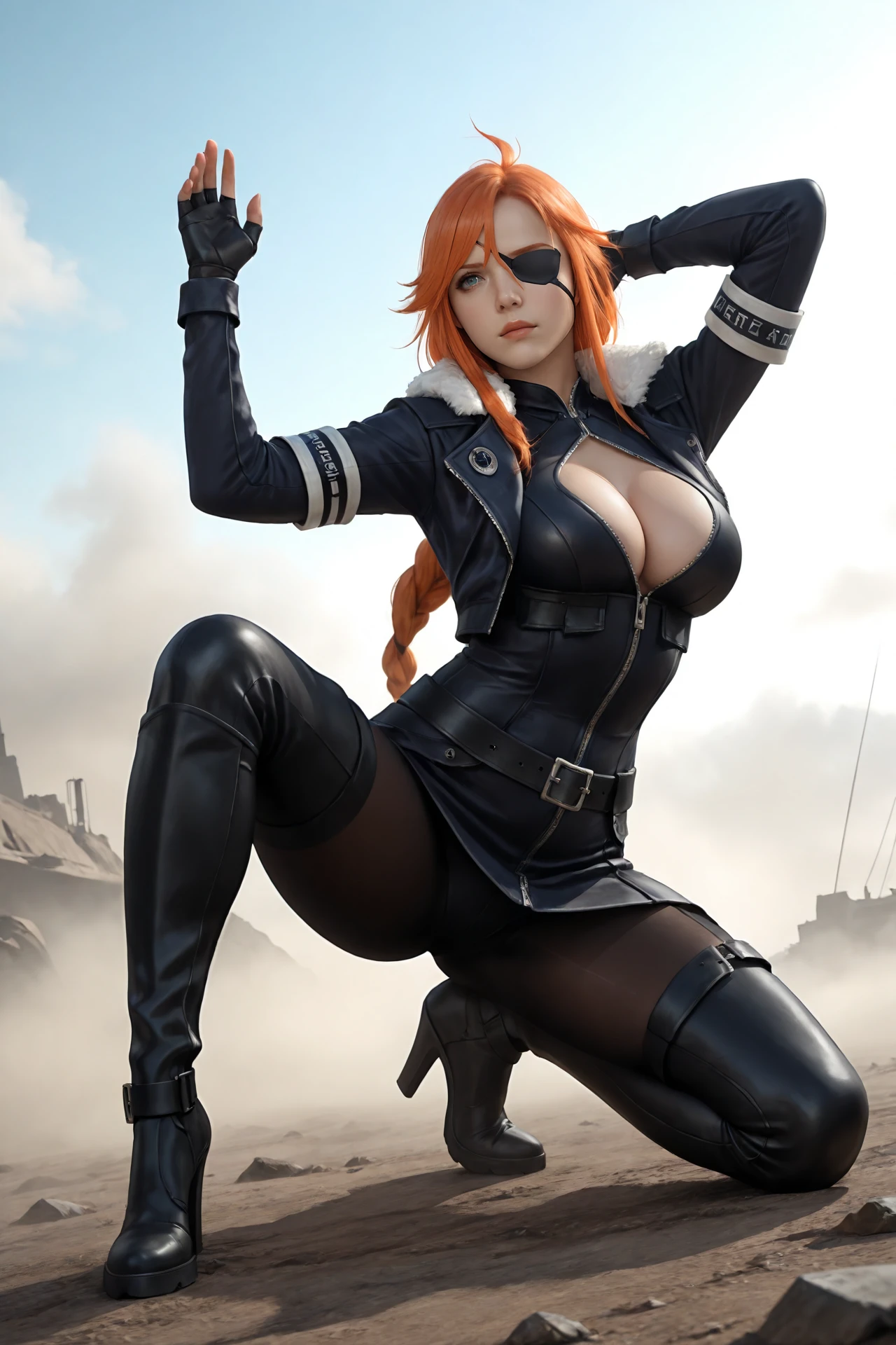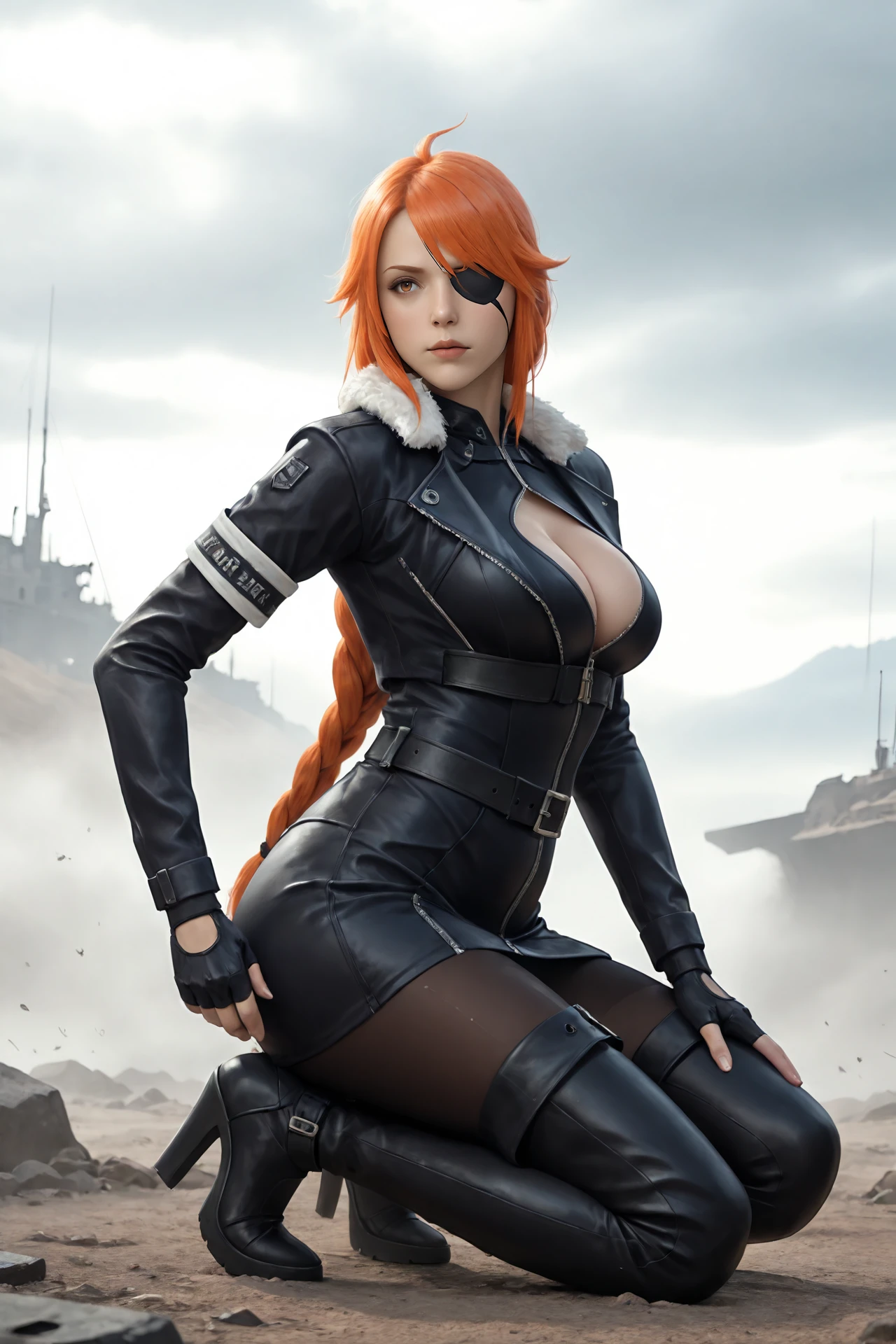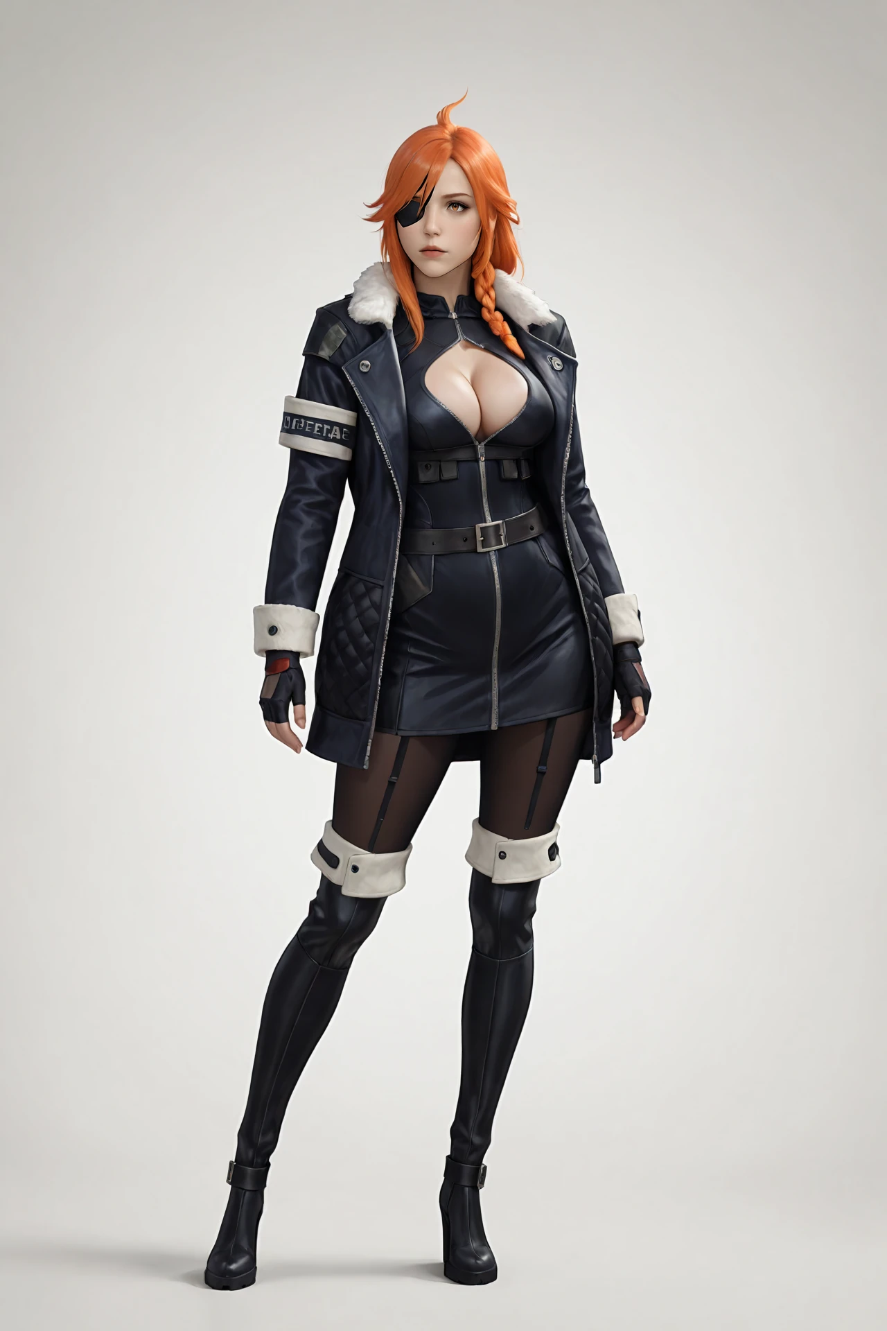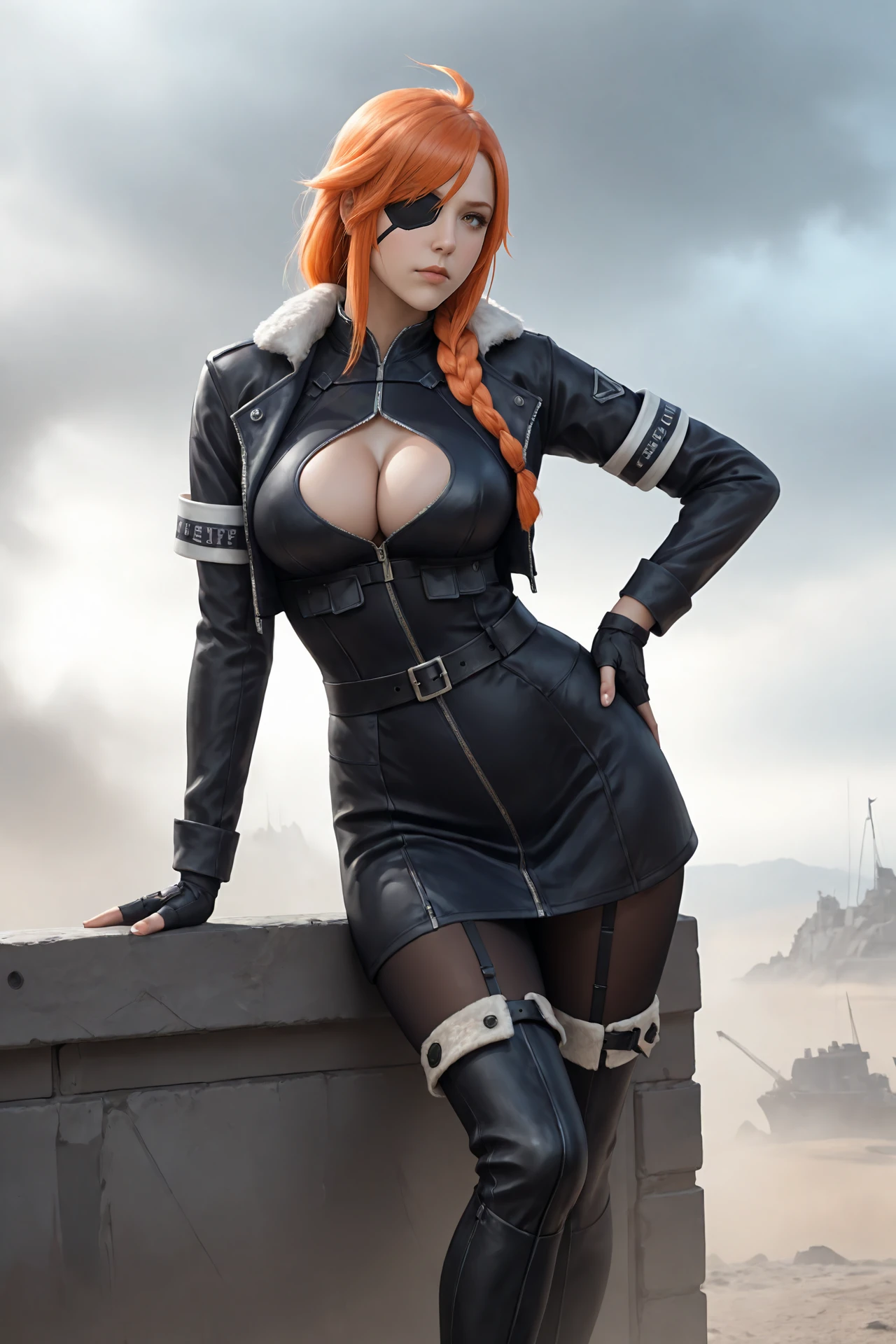 very_long_hair,low_braid,orange_hair,parted_bangs,eyepatch, large_breasts,cleavage_cutout,fur_trim,fur_collar, jacket,zipper_dress,belt_buckle,armband,fingerless_gloves,belt,pantyhose, ankle_belt,thigh_boots,high_heels,