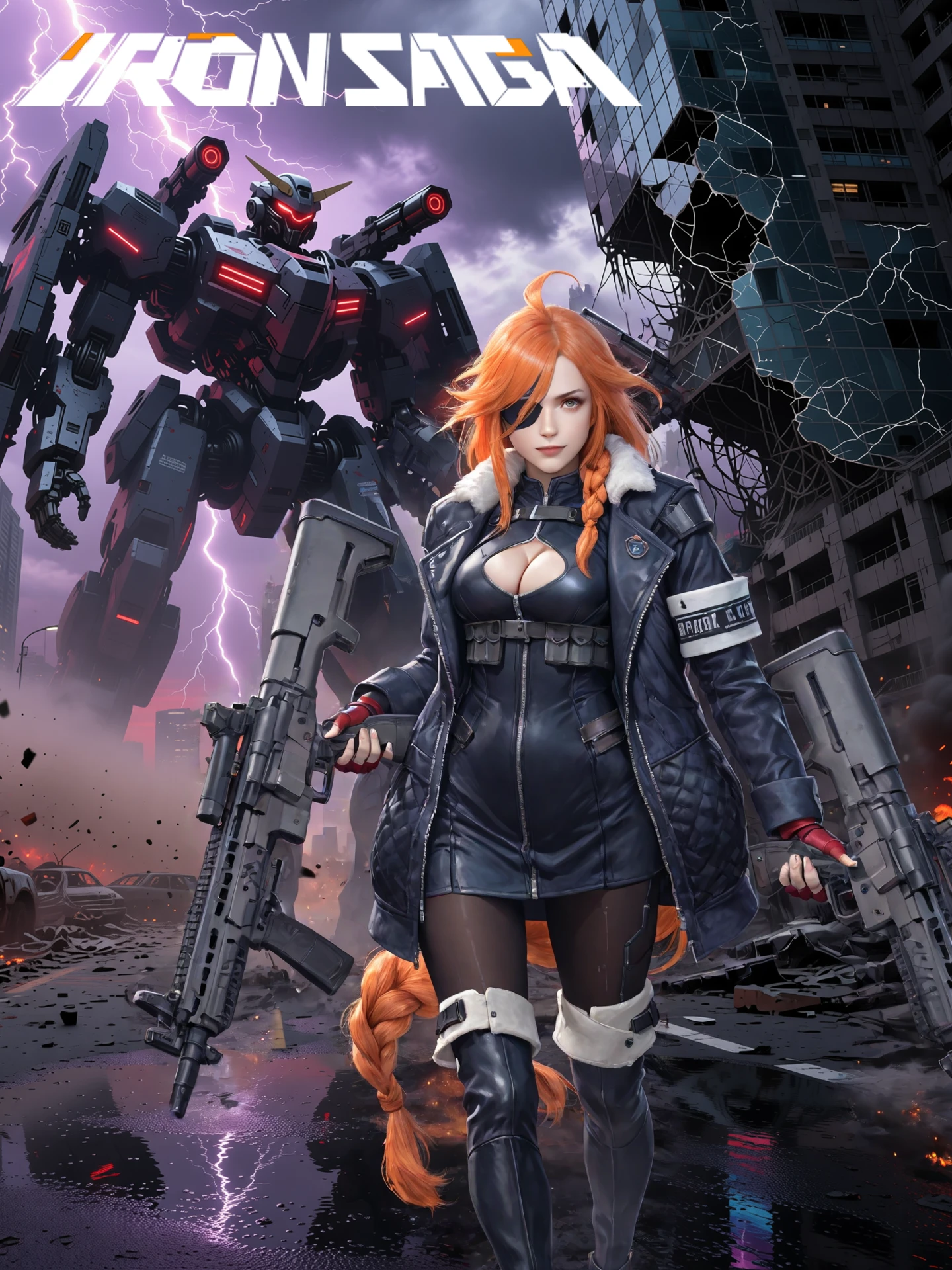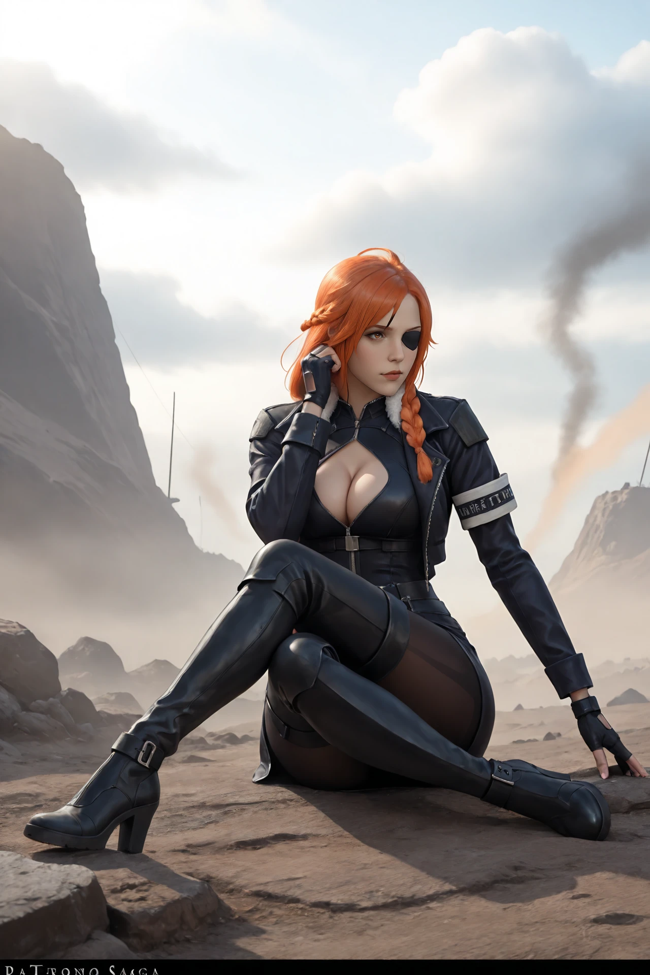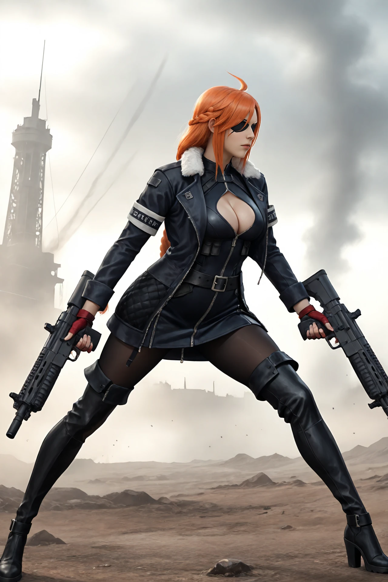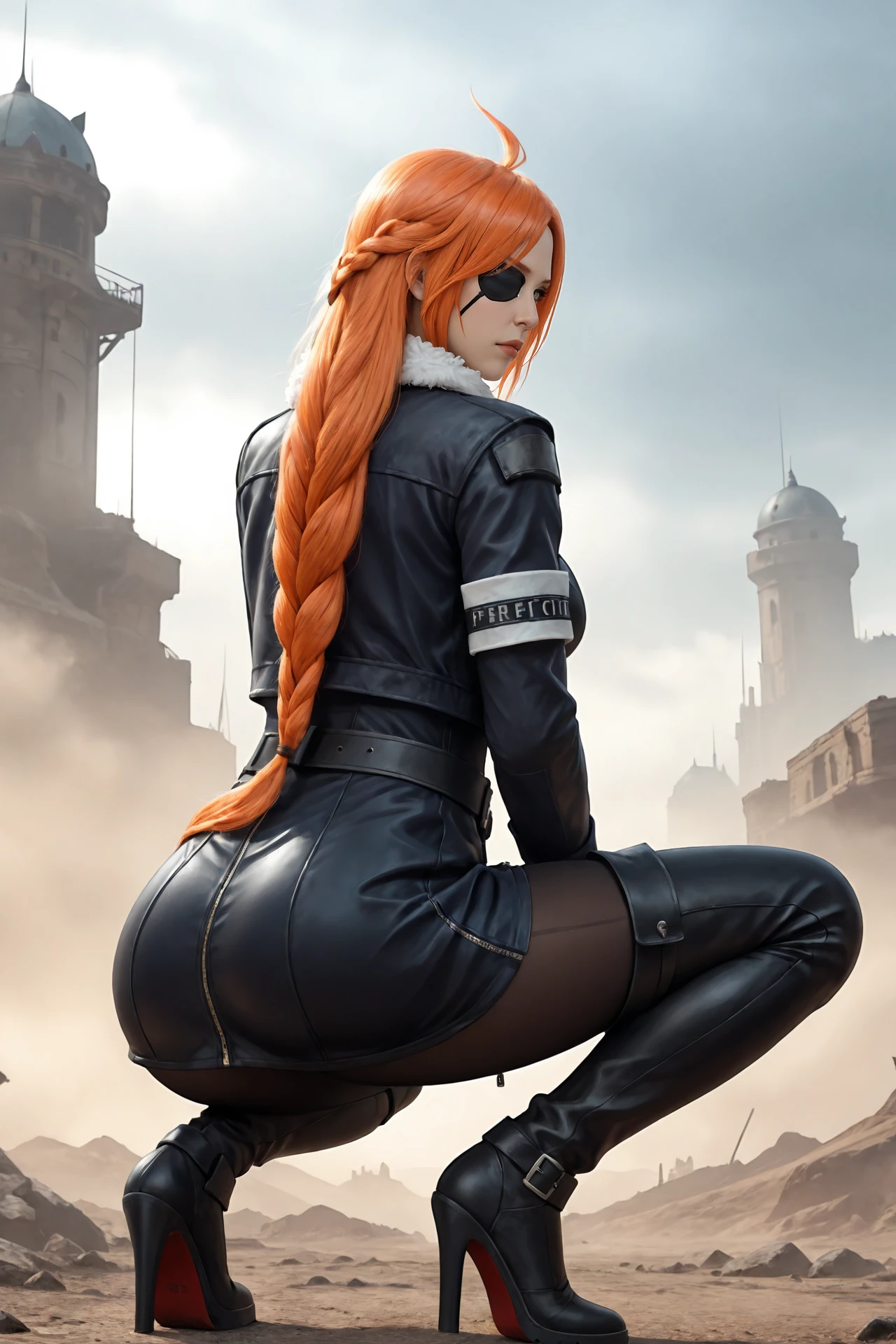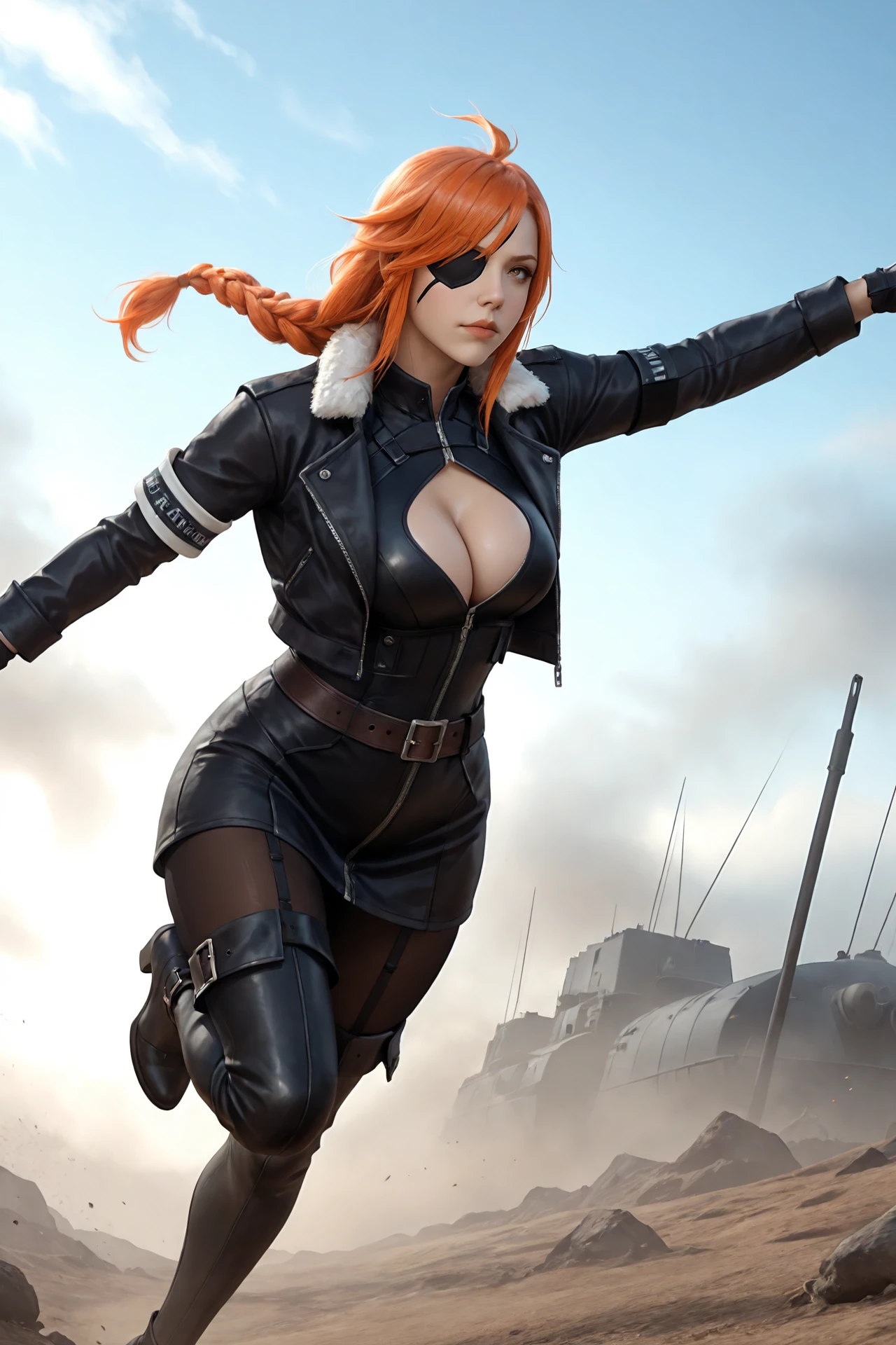 very_long_hair,low_braid,orange_hair,parted_bangs,eyepatch, large_breasts,cleavage_cutout,fur_trim,fur_collar, jacket,zipper_dress,belt_buckle,armband,fingerless_gloves,belt,pantyhose, ankle_belt,thigh_boots,high_heels,