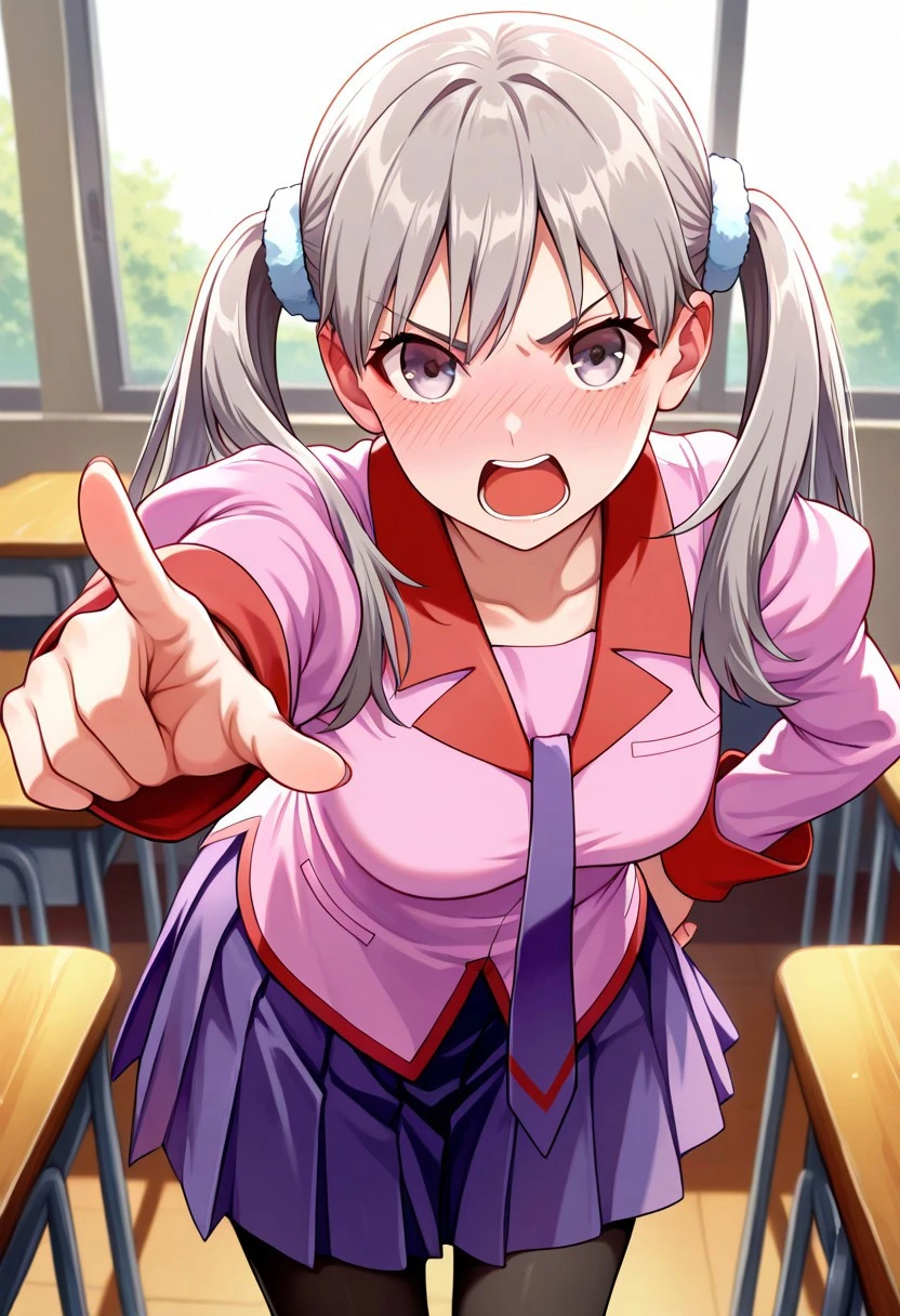 Naoetsu School Uniform, pink shirt, purple necktie, long sleeves, pleated skirt, black pantyhose,