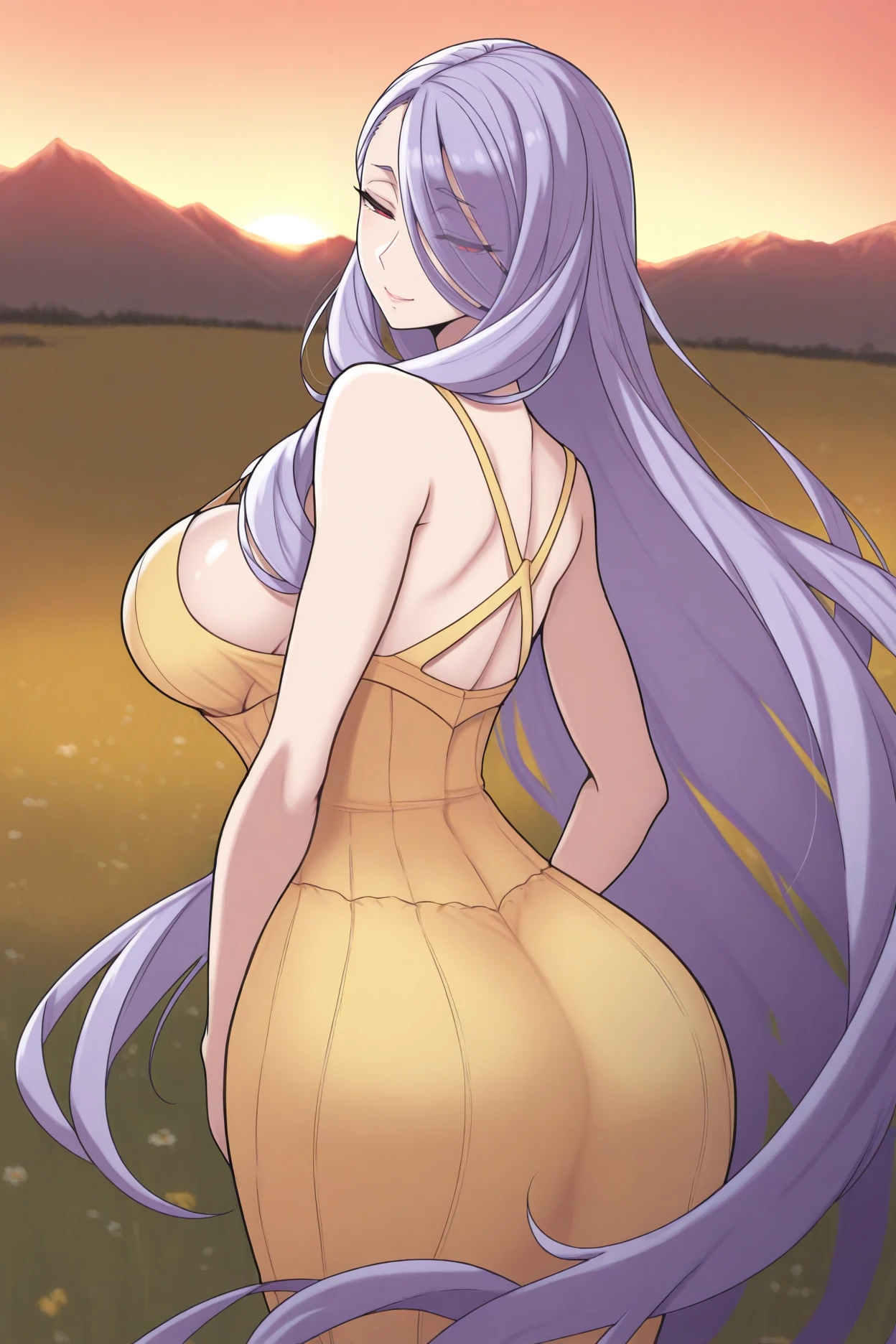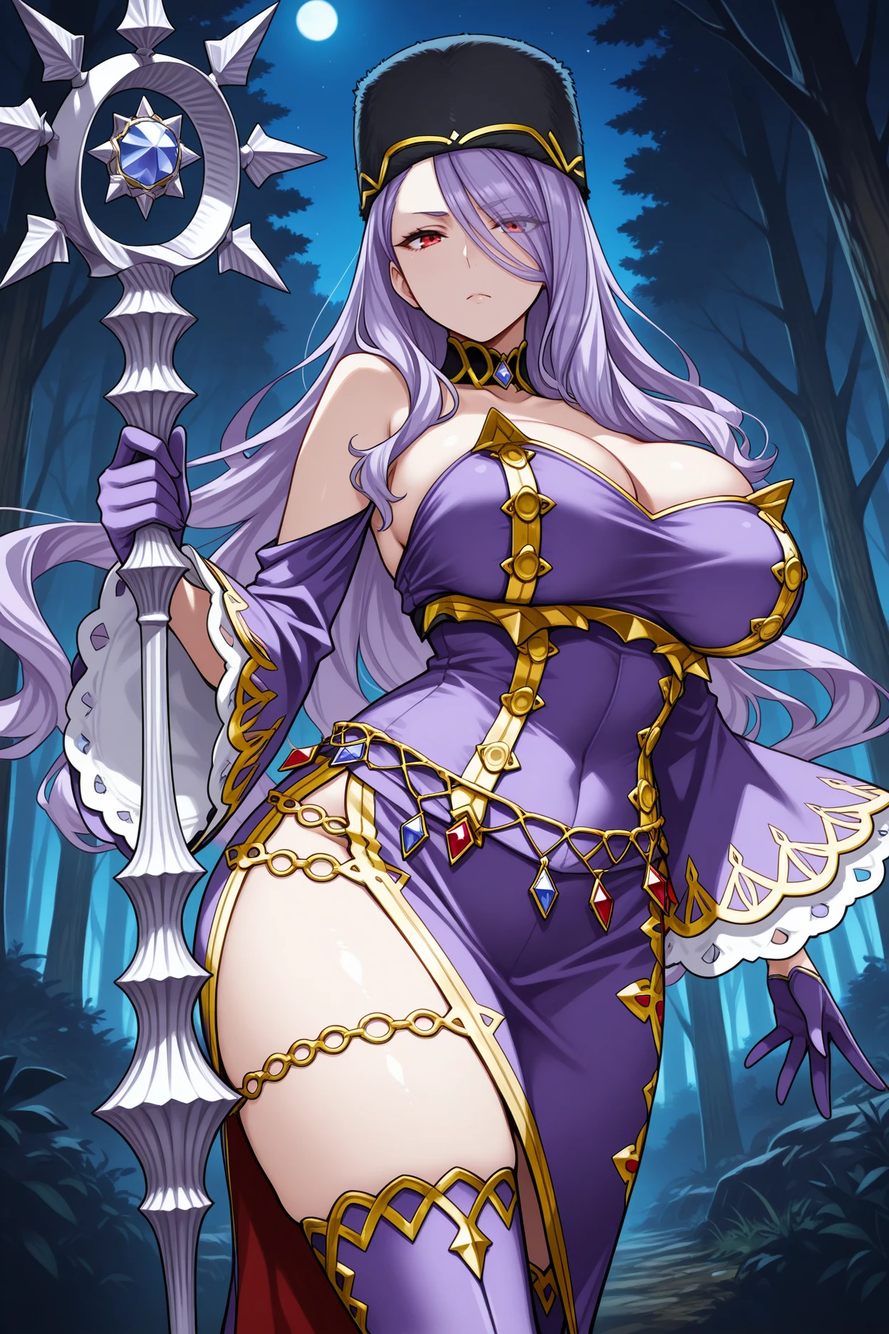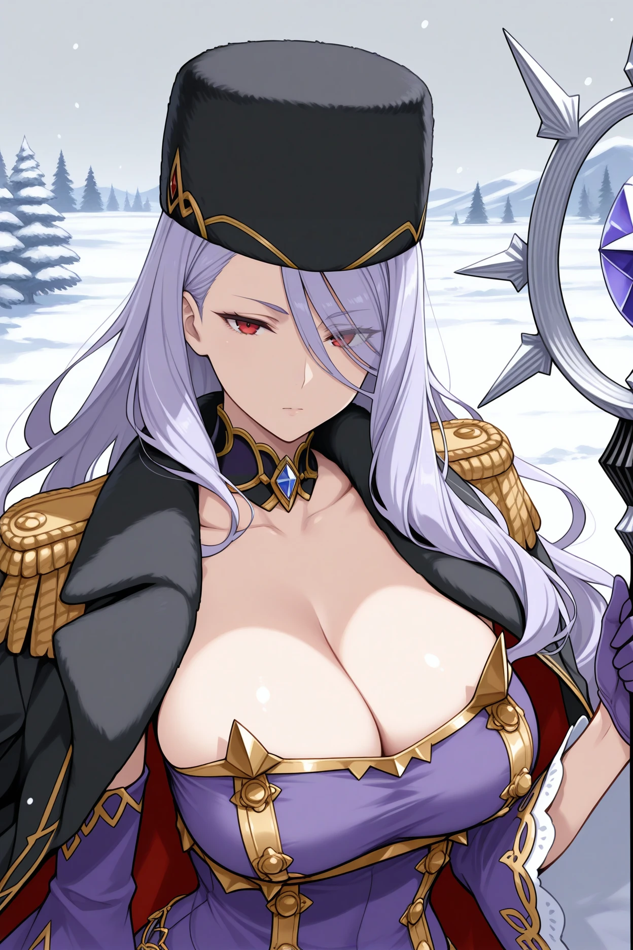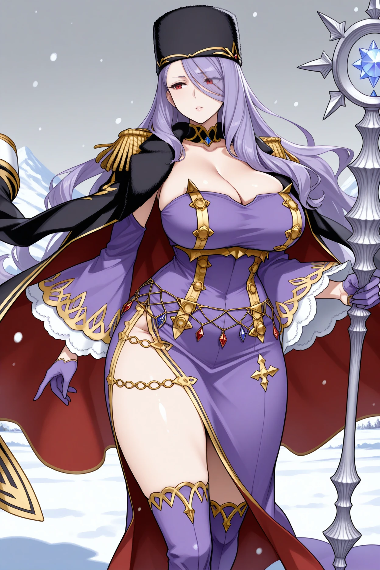 Add "black headwear, fur hat, detached collar, black collar, black coat on shoulders, epaulettes, purple dress, gold trim, cleavage, side slit, detached sleeves, wide sleeves, purple sleeves, purple gloves, thigh boots, purple boots" for her typical look.