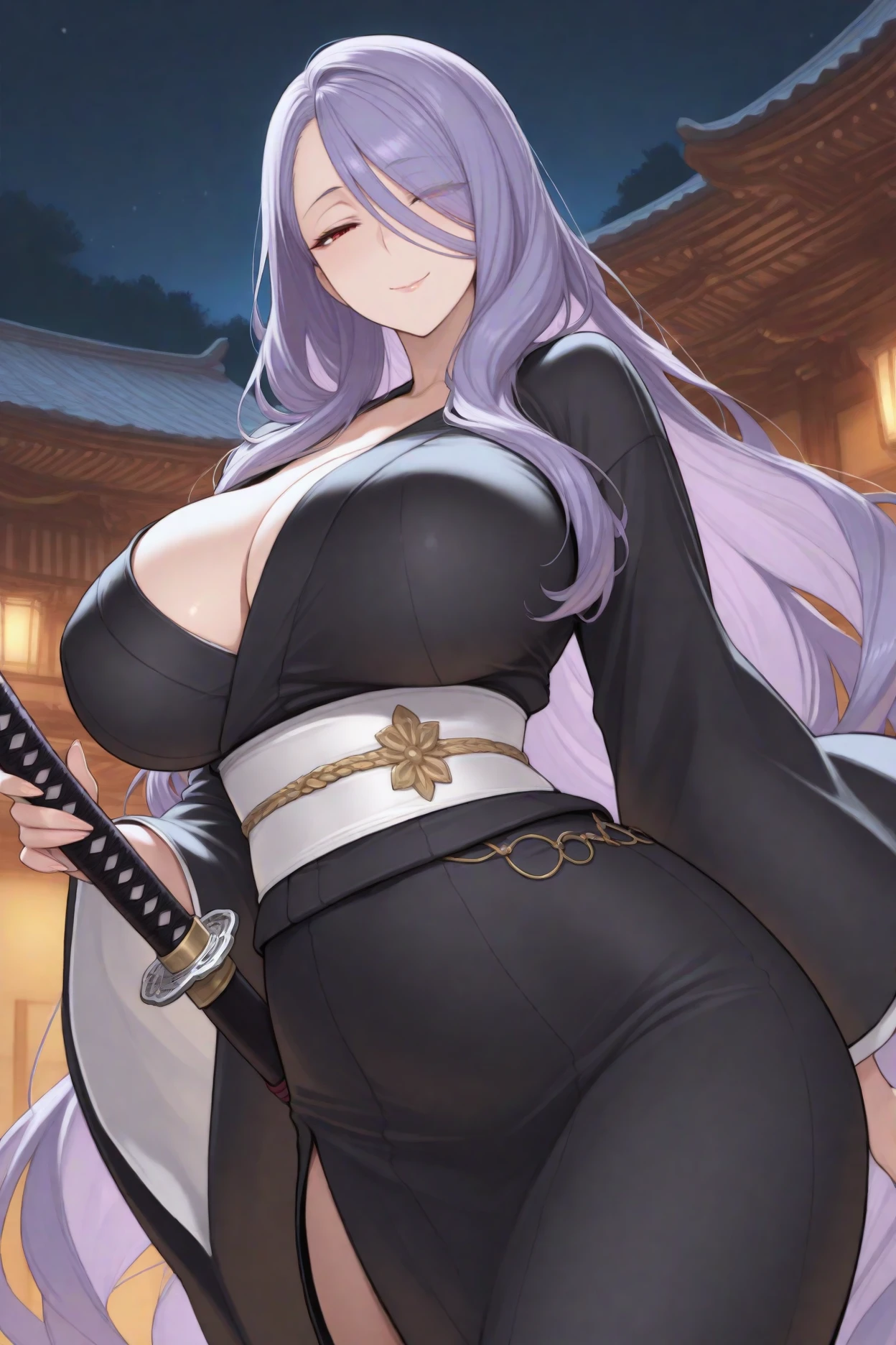 Trigger word is "vccmria" and "purple hair, very long hair, red eyes, hair over one eye" is required.