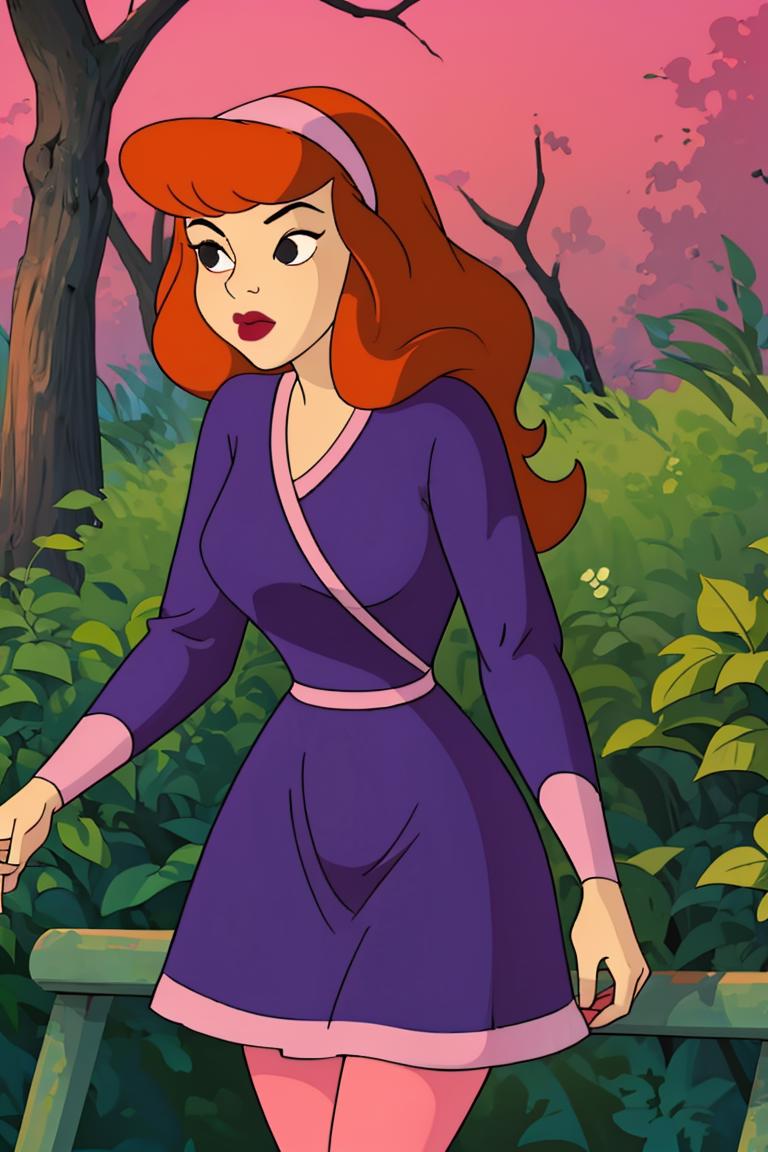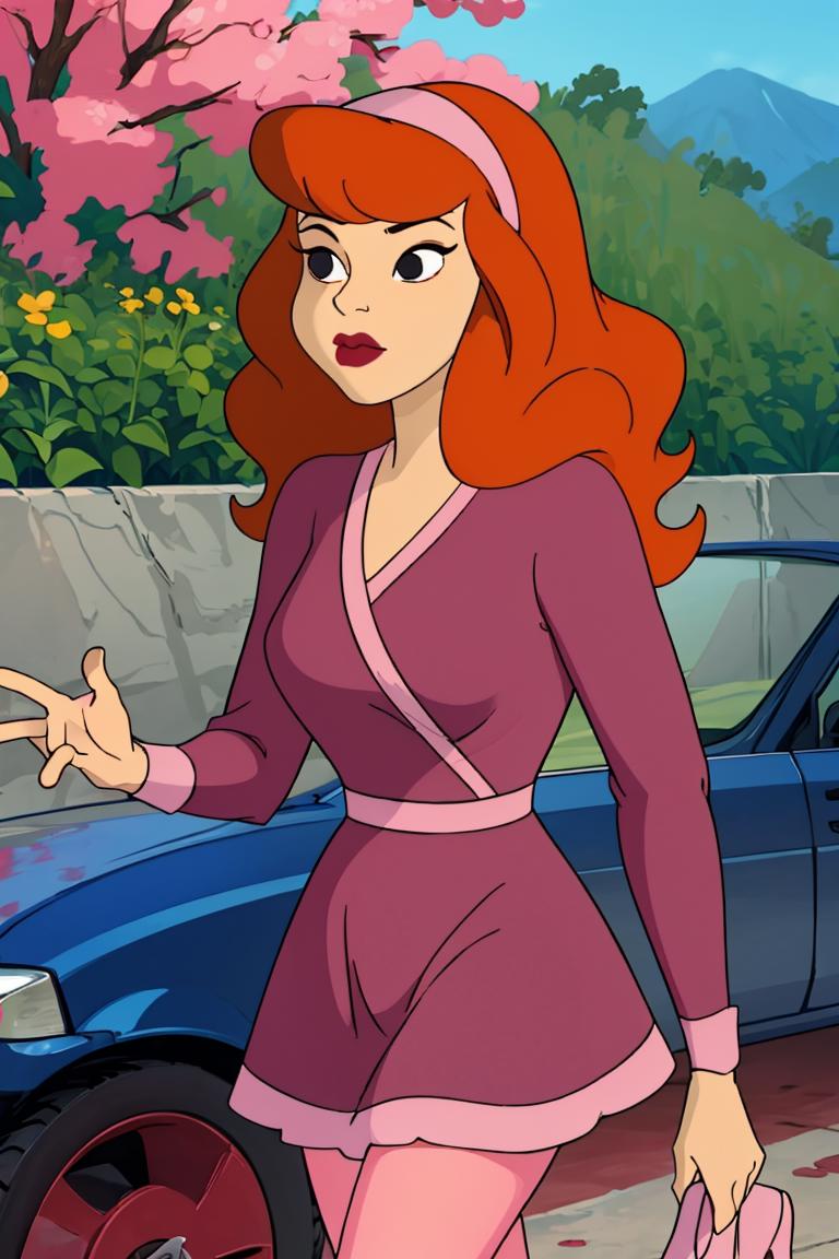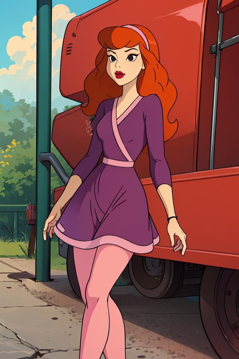 For her original outfit use the tags: pikkydaphne, 1girl, solo, pantyhose, hairband, dress, orange hair, black eyes, makeup, lipstick, pink pantyhose, outdoors, day, long hair