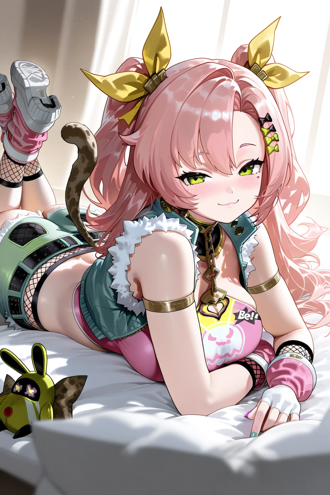 nicole demara \(cunning cutie\), 1girl, green eyes, pink hair, solo, long hair, two side up, tail, crop top, hair ornament, mole, ribbon, hair ribbon, tube top, hairclip, cutoffs,