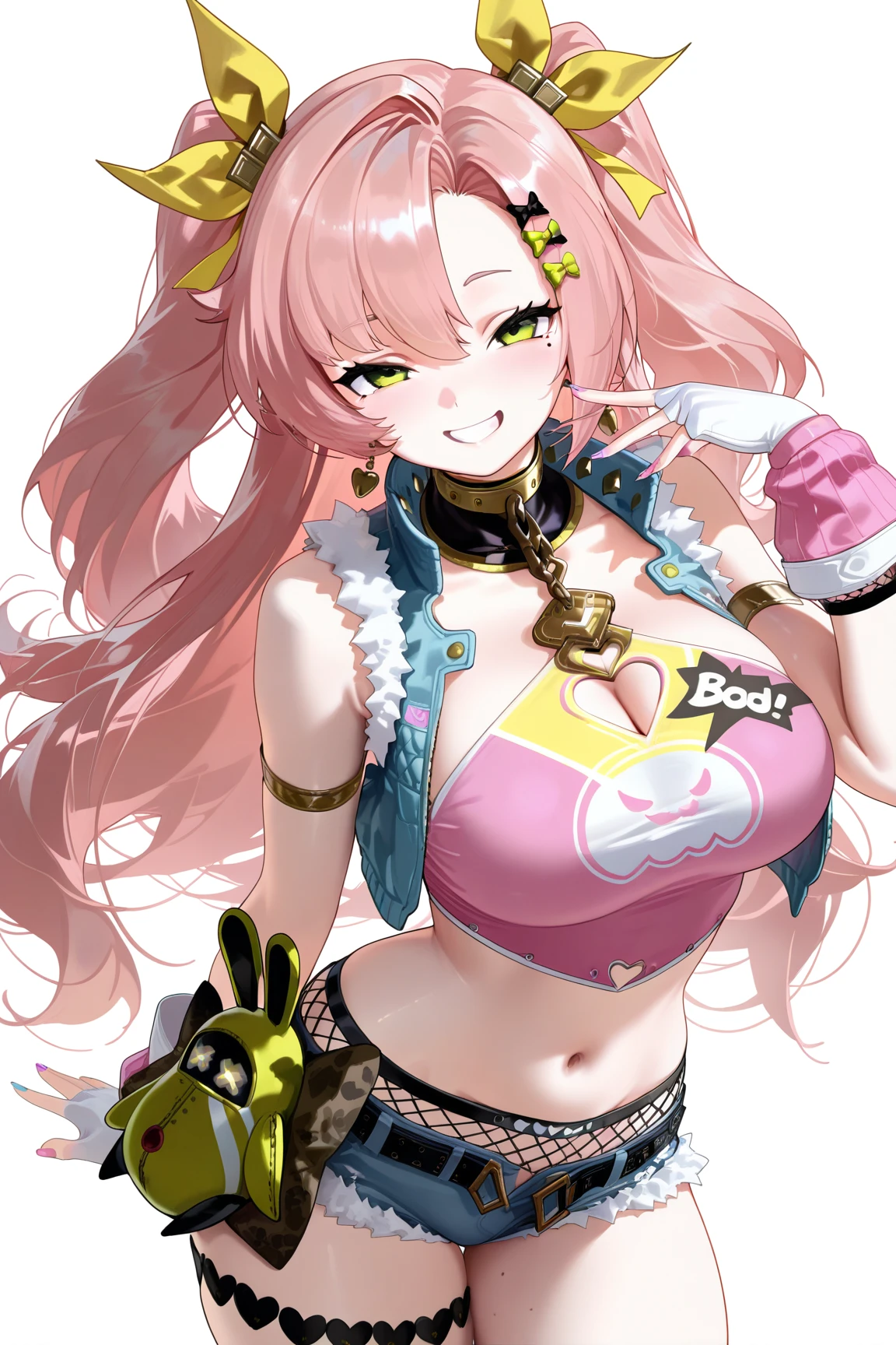 nicole demara \(cunning cutie\), 1girl, green eyes, pink hair, solo, shorts, long hair, two side up, tail, crop top, hair ornament, midriff, cutoffs, mole, ribbon, thigh strap, hair ribbon, gloves, tube top, thighs, short shorts, strapless, hairclip, white gloves, fur-trimmed shorts, belt, cutoffs,