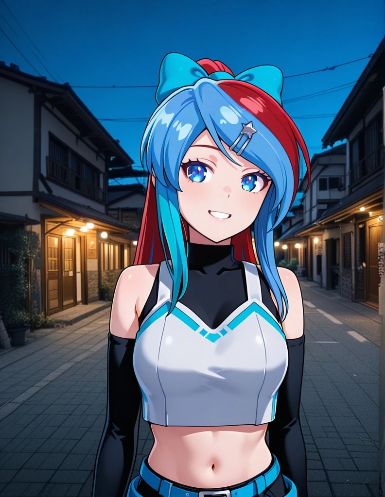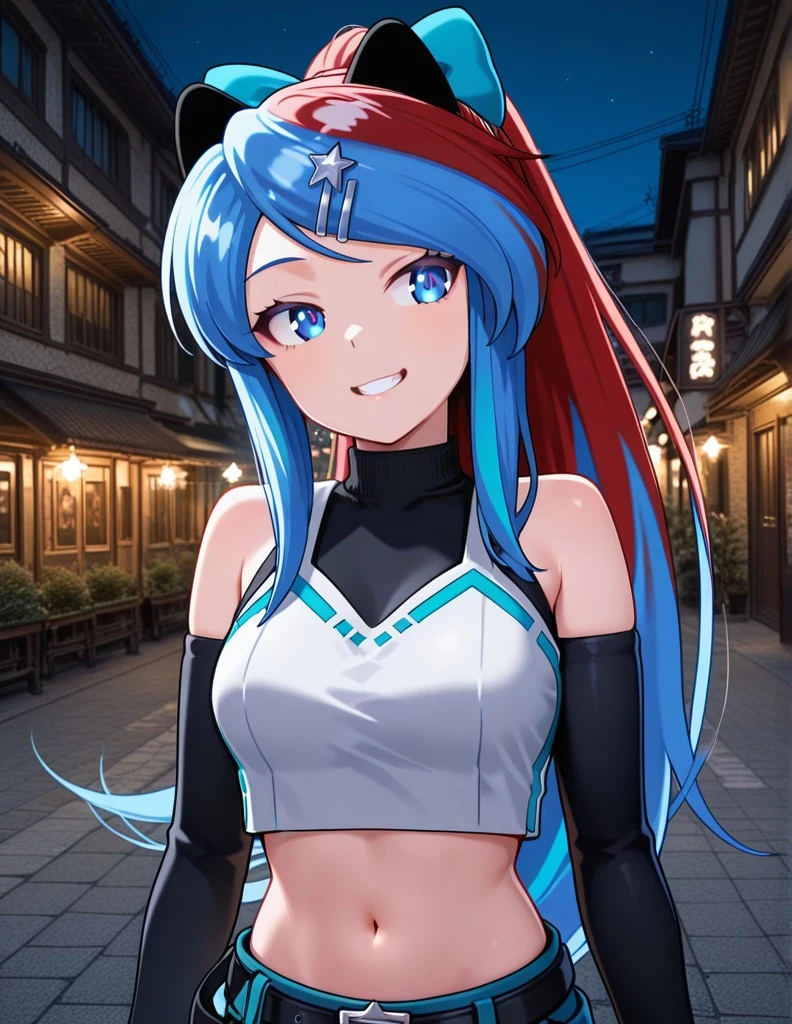 ,Aitzu Arashi, v2, 1girl, solo, long hair, breasts, blue eyes, hair ornament, bow, navel, medium breasts, ponytail, multicolored hair, sidelocks, hair bow, cowboy shot, hairclip, star (symbol), two-tone hair, streaked hair, swept bangs, blue bow,star hair ornament,blue hair, red hair,