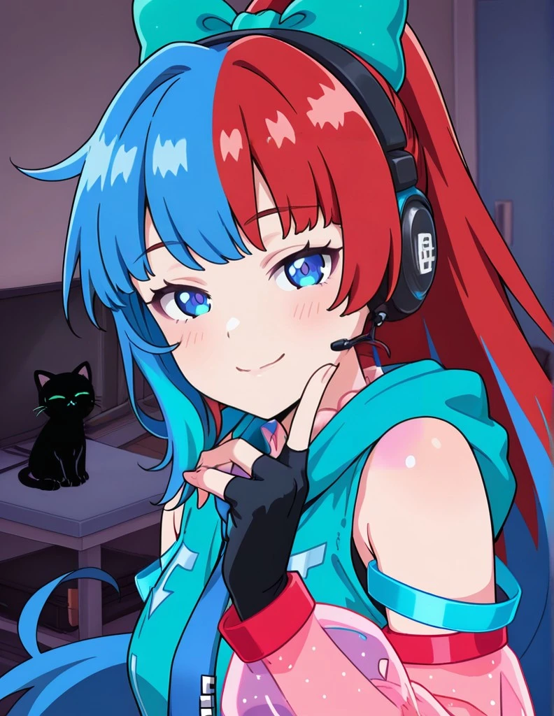 Aitzu Arashi, 1girl, solo, long hairbow, very long hair, blue hair, multicolored hair, hair bow, red hair, headphones, split-color hair, two-tone hair,blue eyes, ponytail,