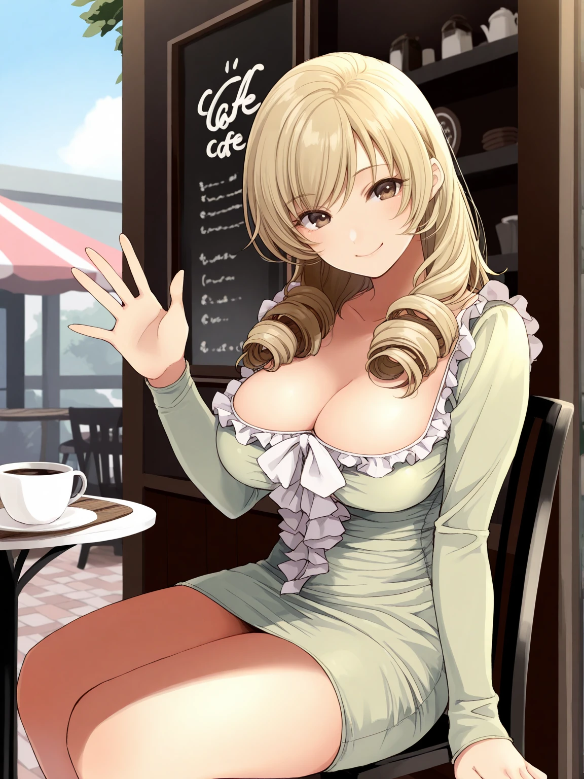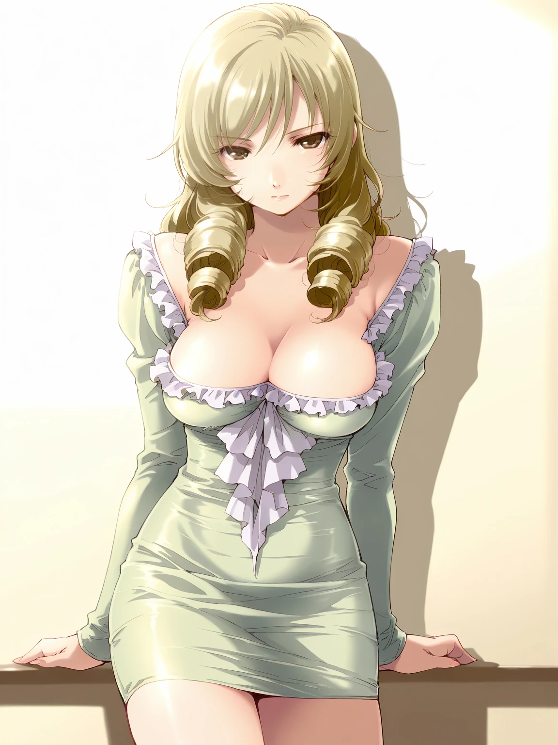 misoraari, blonde hair, long hair, twin drills, brown eyes, large breasts